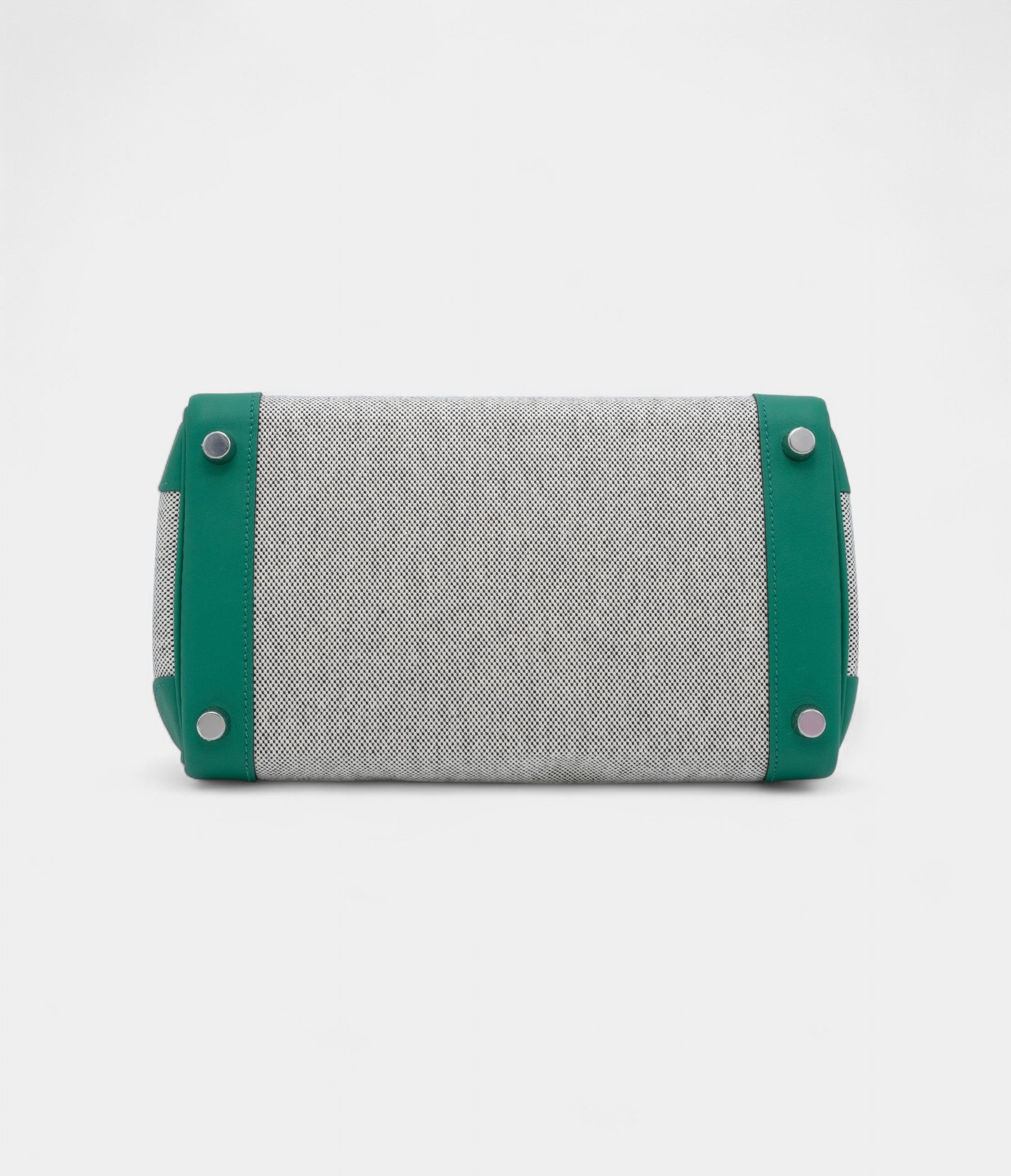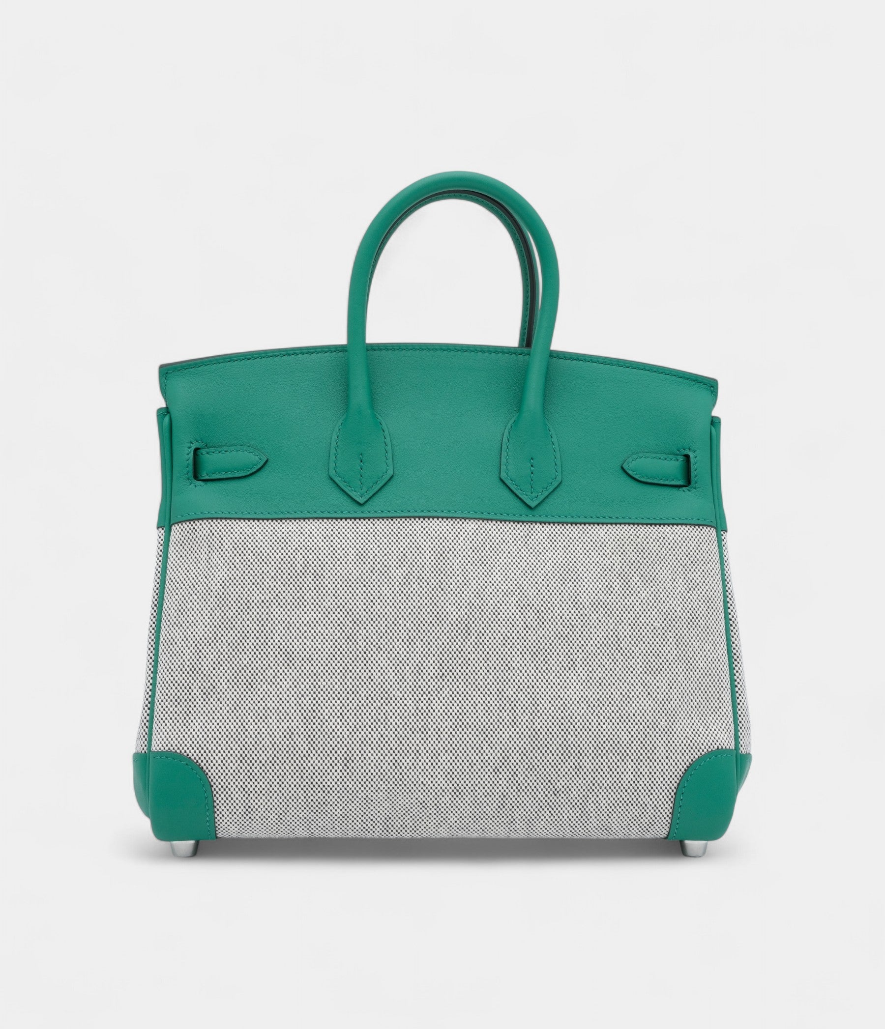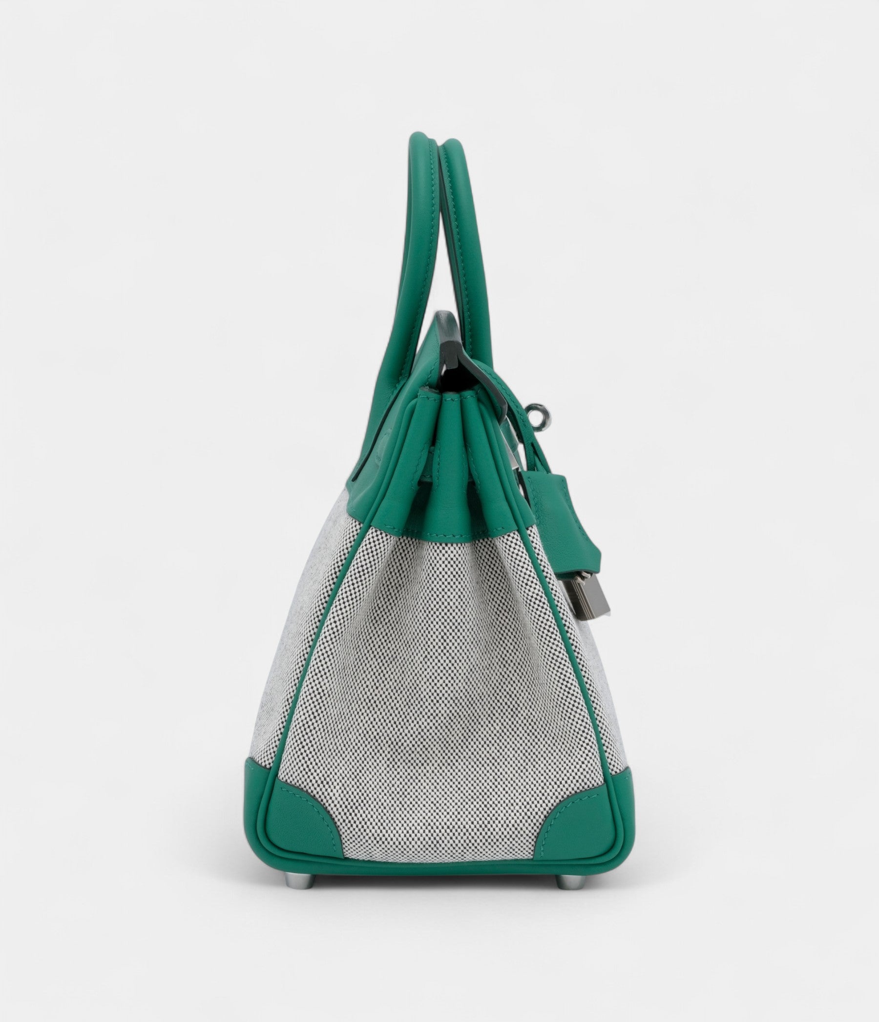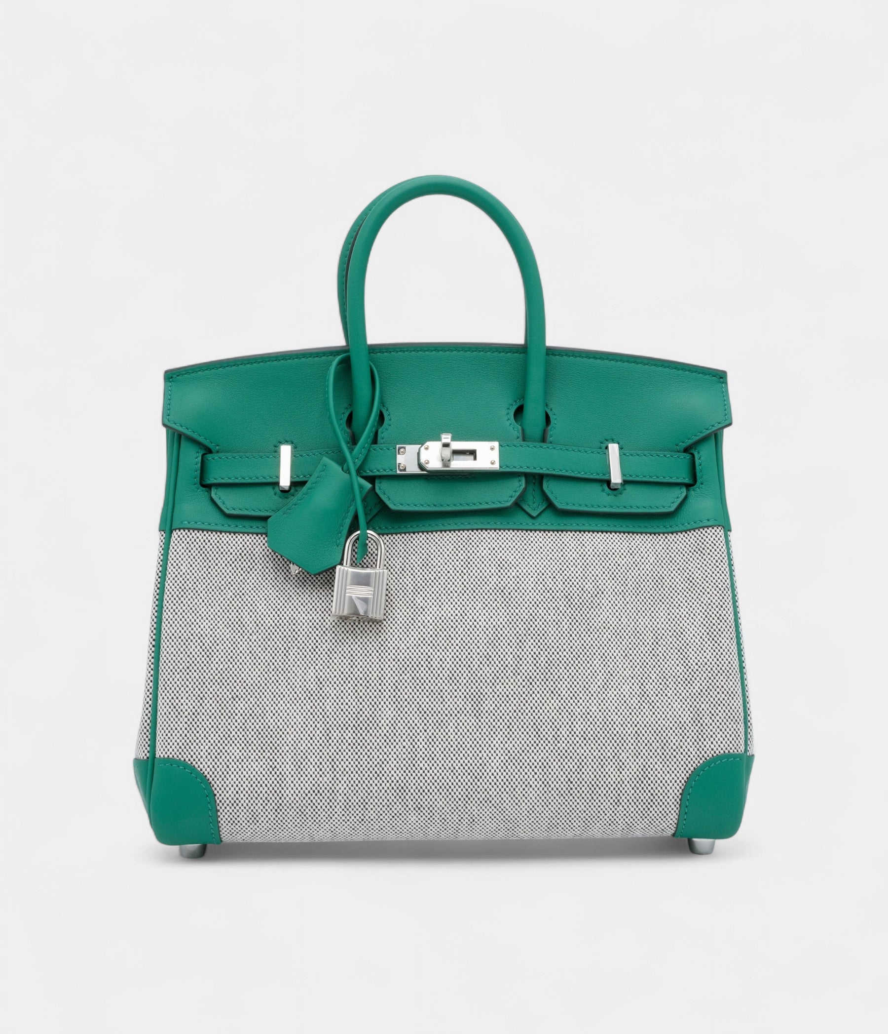 The Hermès Birkin 25 in Vert Vertigo Swift with Ecru & Black Quadrille toile and palladium hardware is a bold, architectural masterpiece of color and texture.
