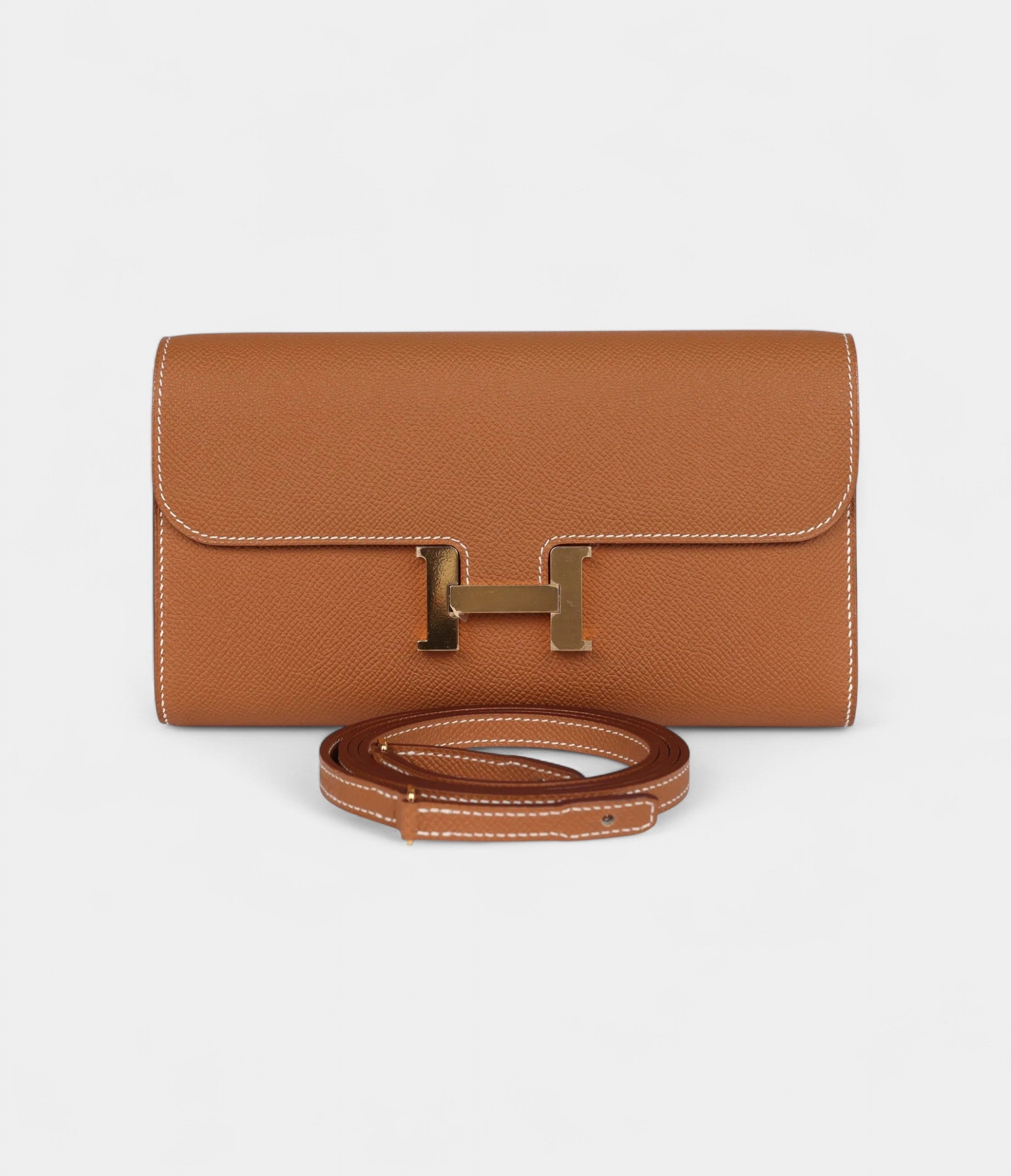The Hermès Constance Wallet To Go in Gold Epsom leather combines timeless elegance with versatile functionality for the modern individual.