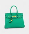 The Hermès Birkin 30 Green Leather Tote is a striking embodiment of luxury, crafted from premium leather in a rich green hue. Its structured silhouette, refined detailing, and impeccable craftsmanship make it a coveted piece in haute couture.