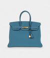 A timeless Hermès Birkin 35 in Blue Jean Togo leather with gold hardware, offering a perfect blend of elegance and versatility.