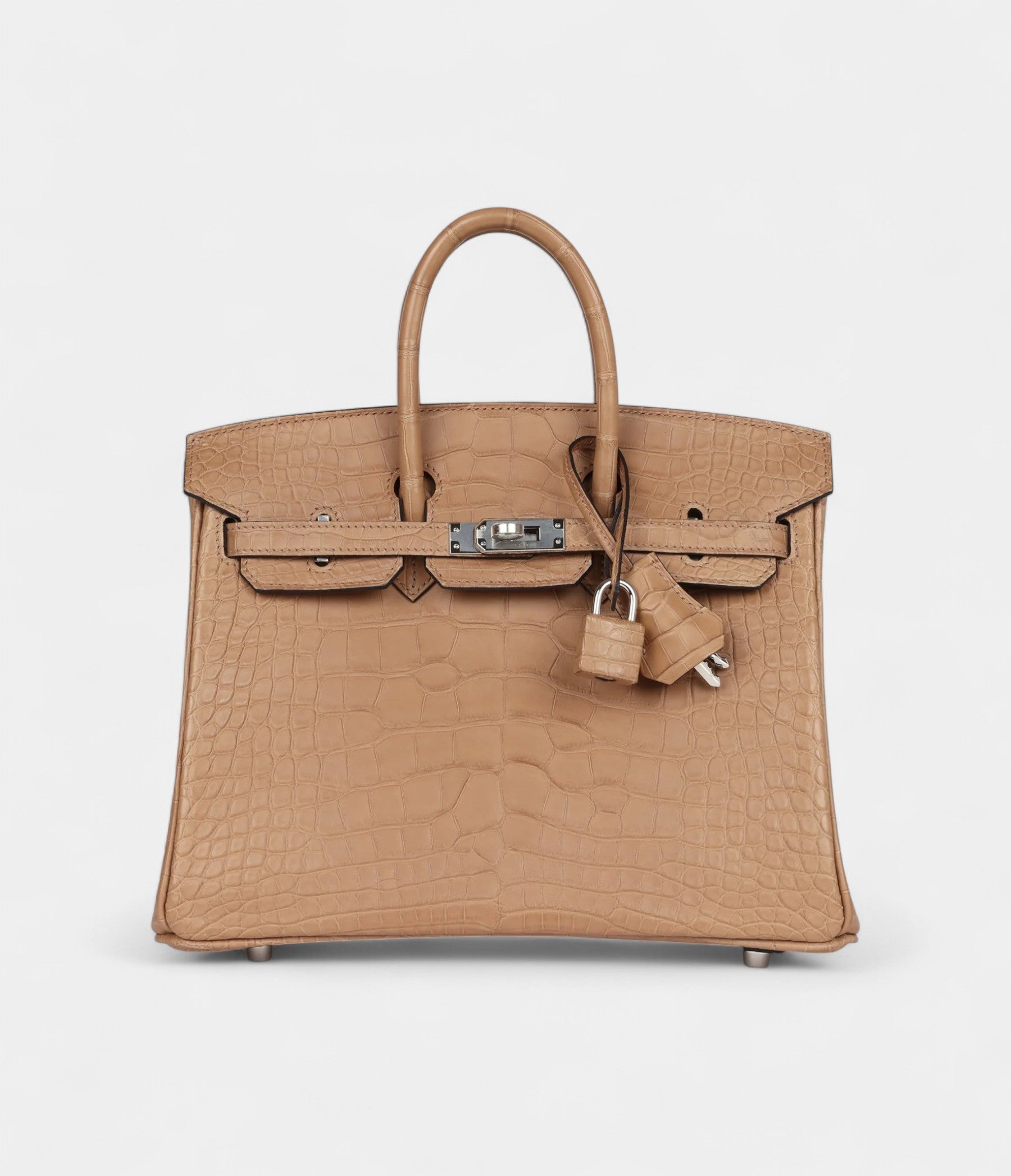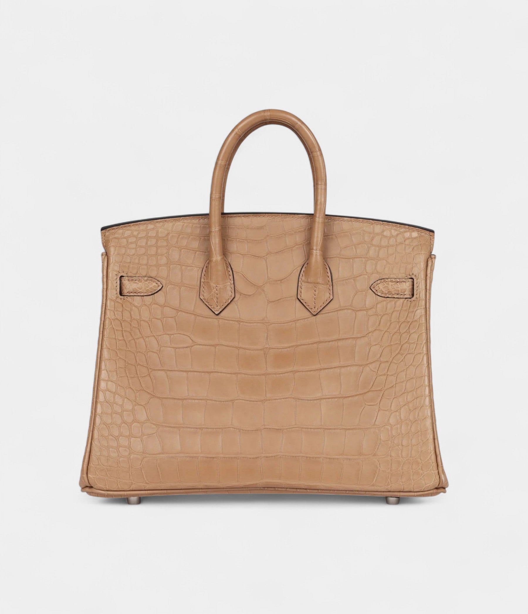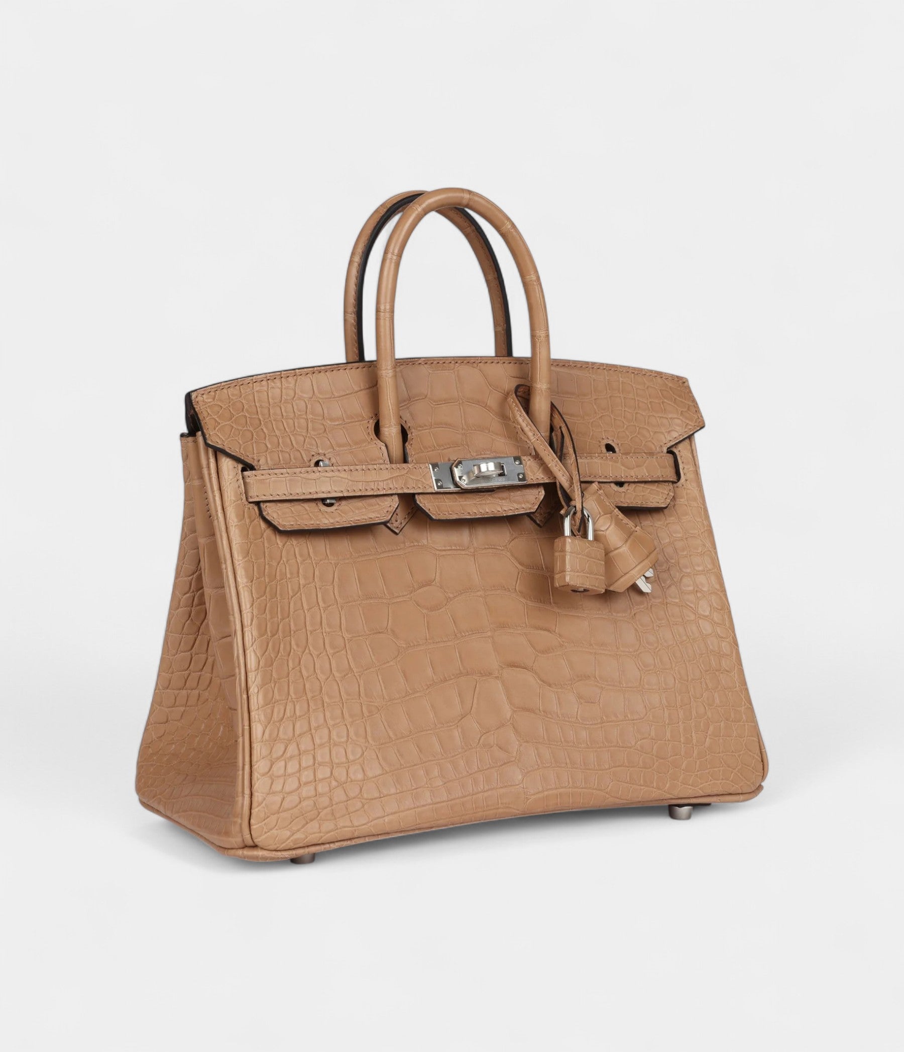 Softly sophisticated, the Hermès Birkin 25 in Chai Matte Alligator with palladium hardware is understated exotic luxury at its finest.