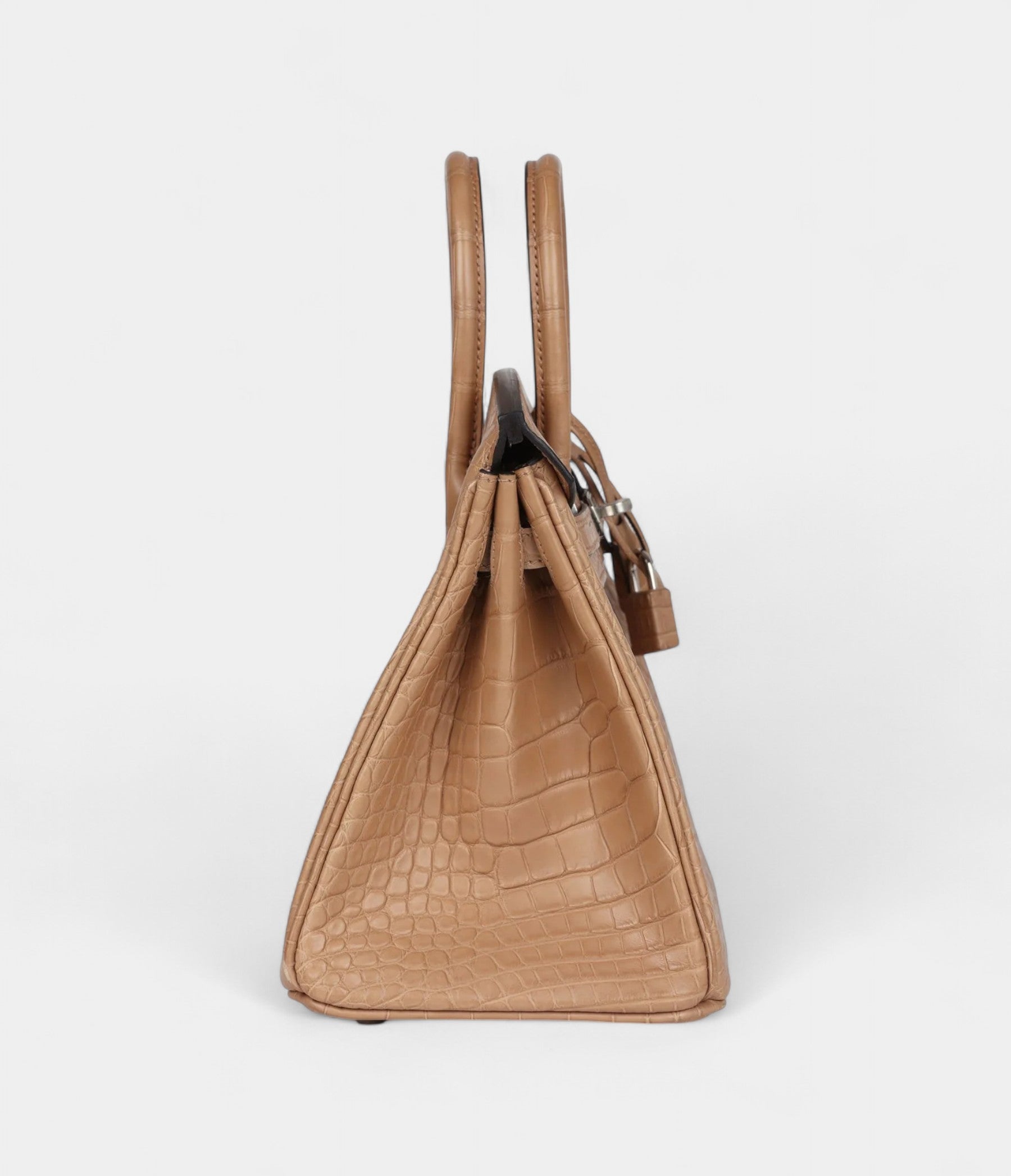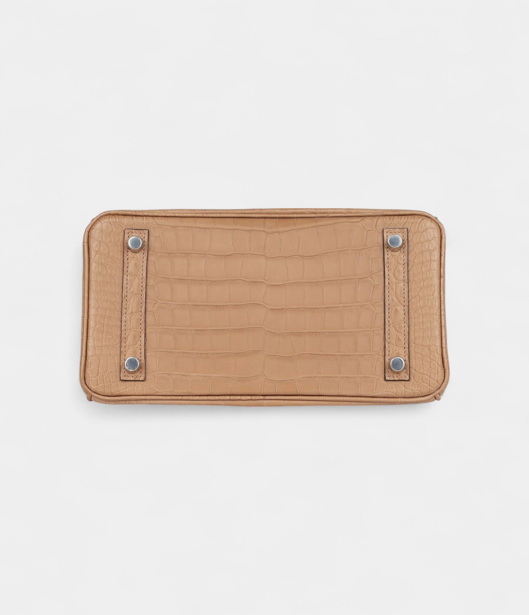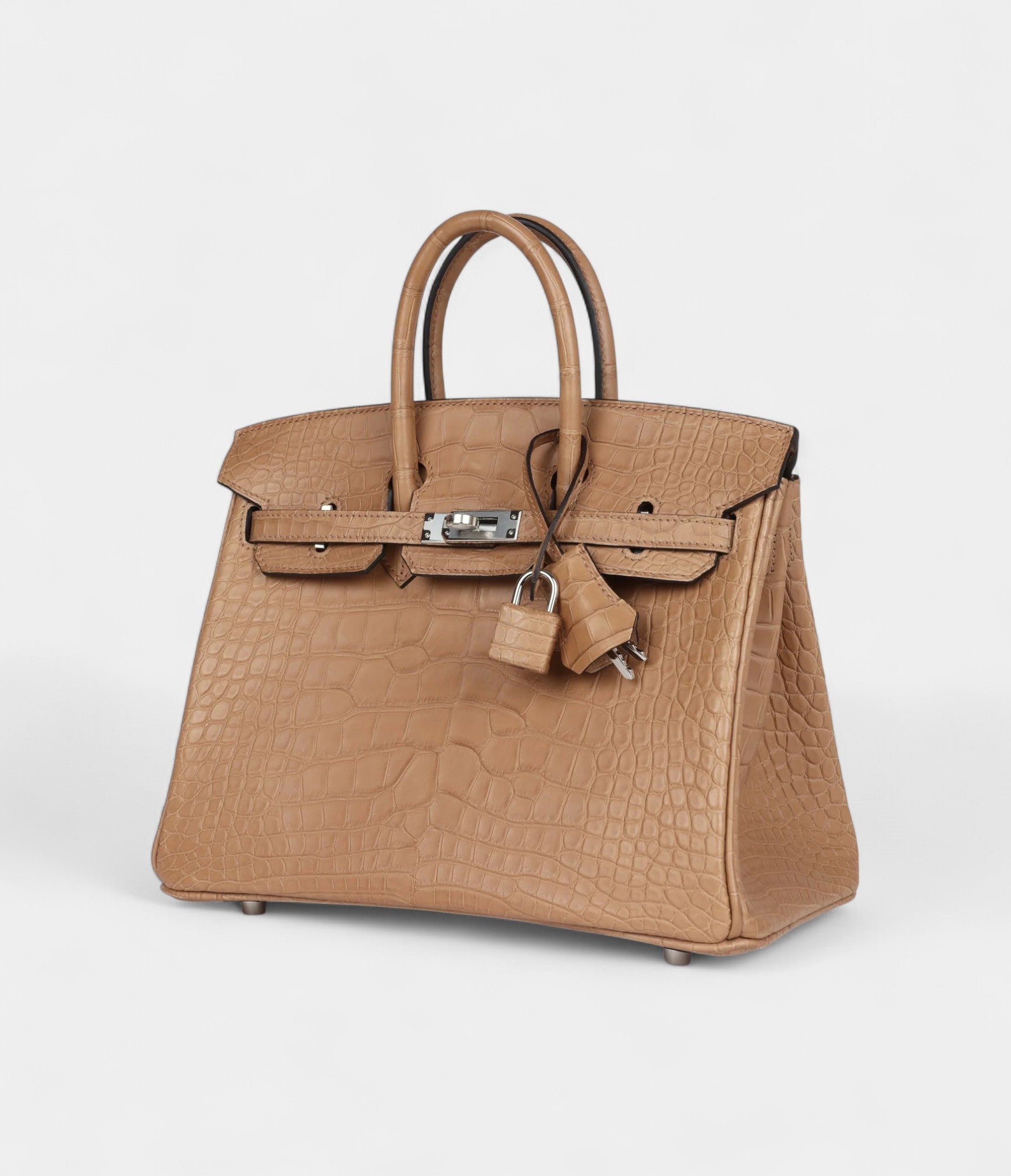 Softly sophisticated, the Hermès Birkin 25 in Chai Matte Alligator with palladium hardware is understated exotic luxury at its finest.
