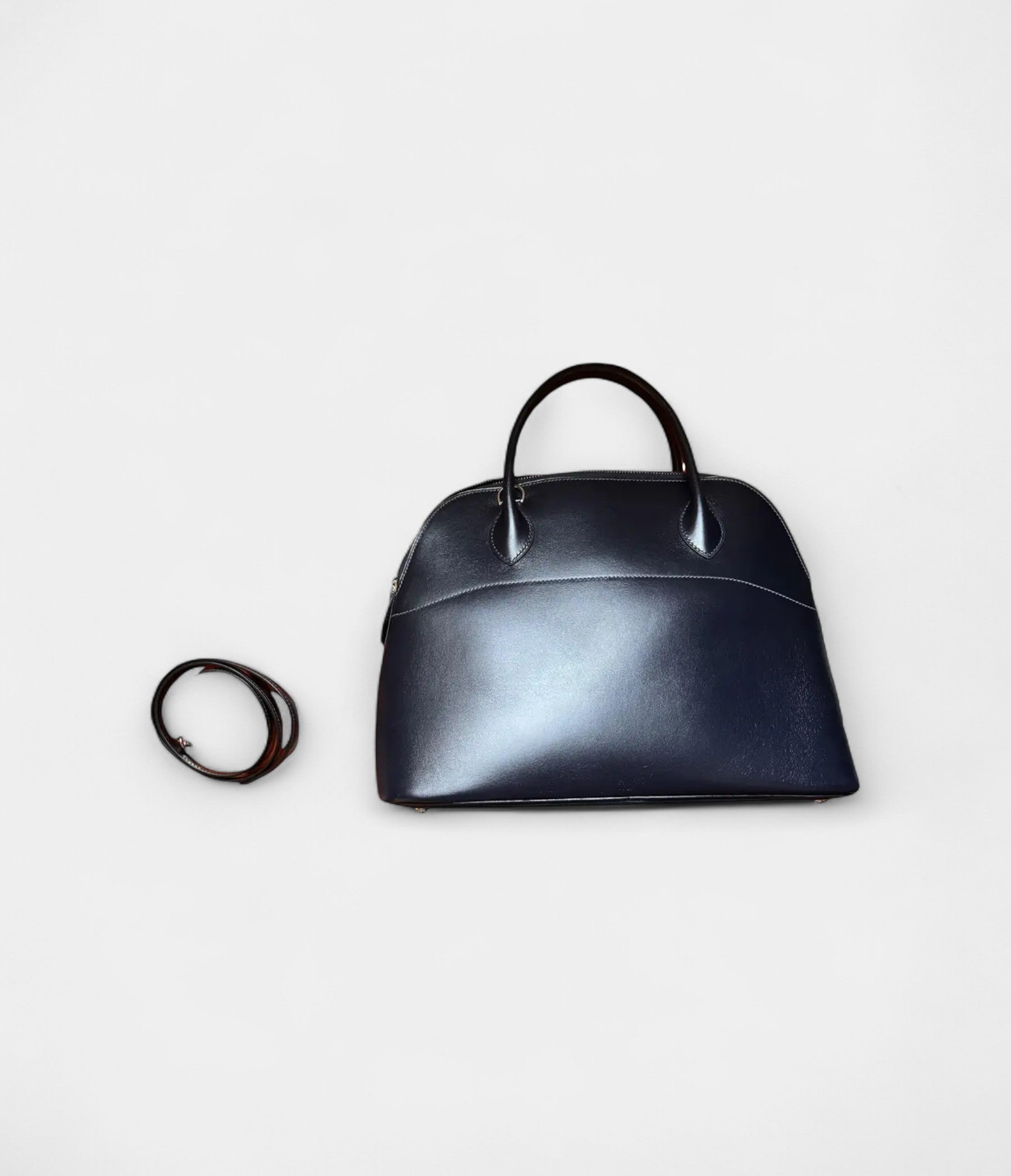 The Hermès Bolide 31 in navy Box calf leather offers structured elegance with a detachable strap for versatile, timeless wear.