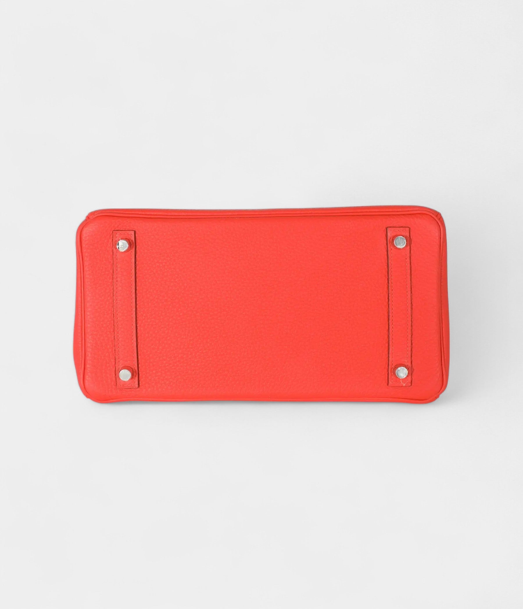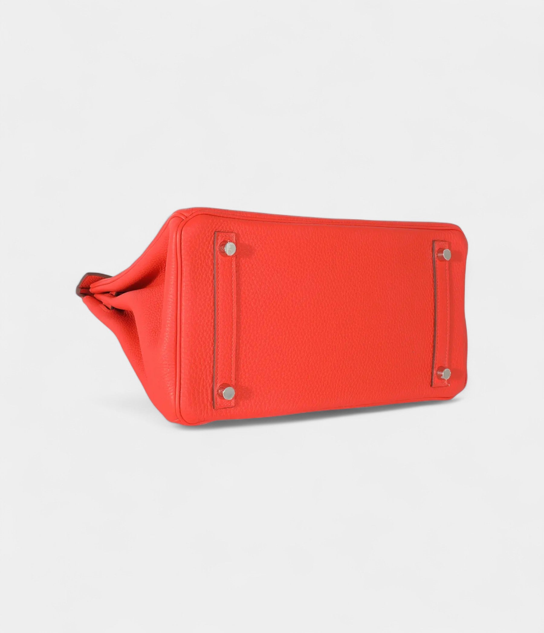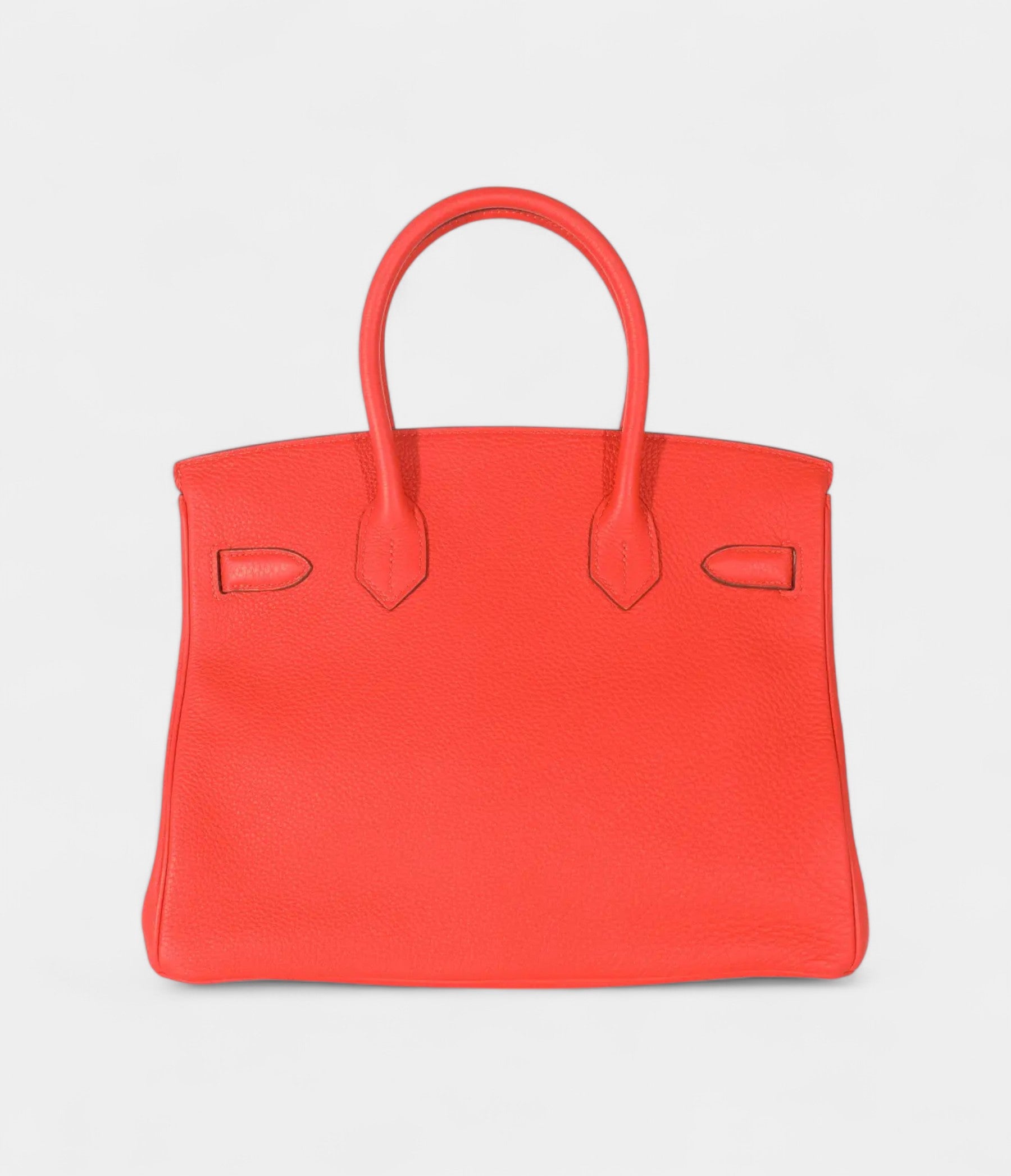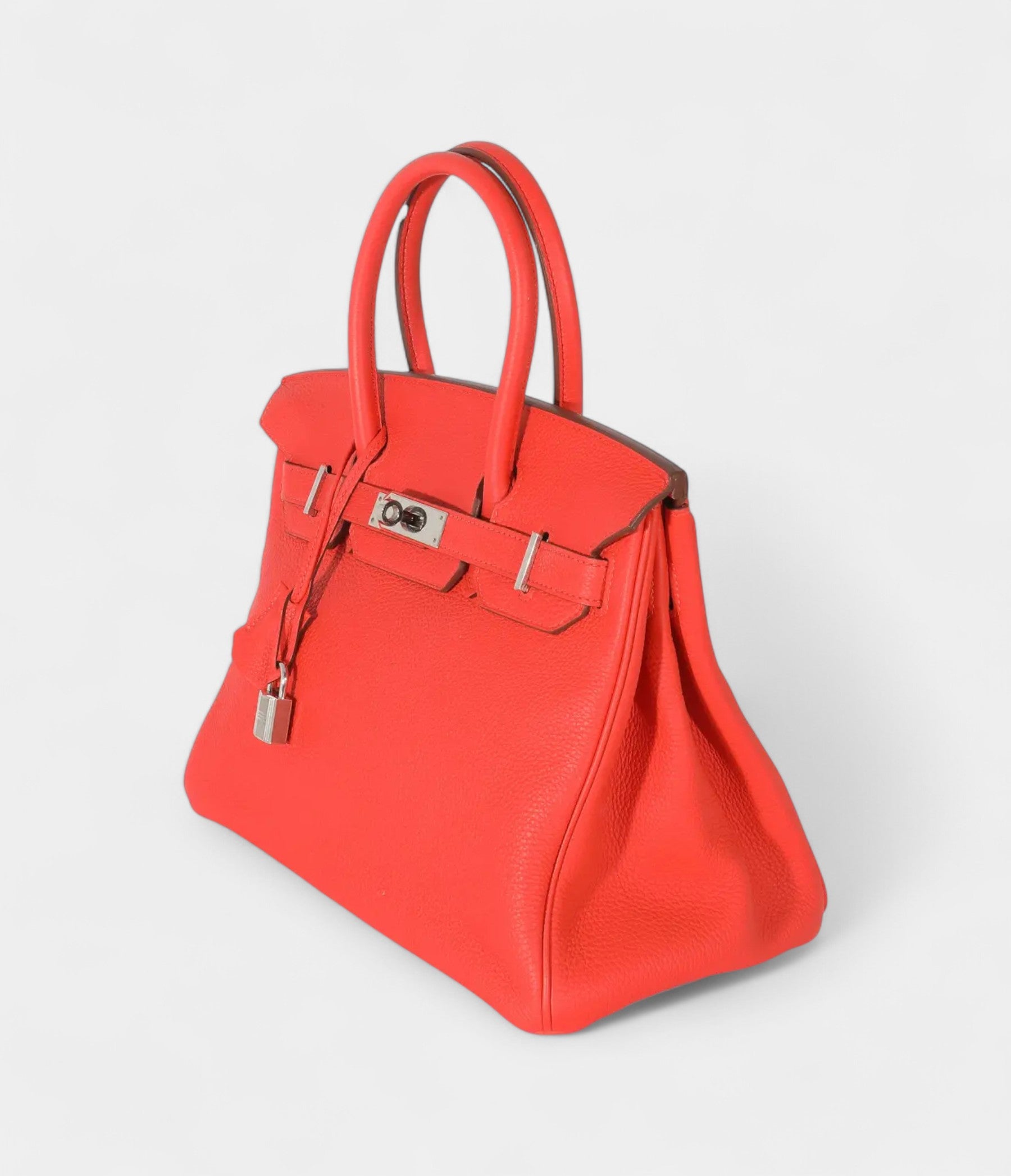 The Hermès Birkin 30 in Capucine Togo leather is a vibrant and sophisticated handbag that embodies timeless elegance. Crafted from durable Togo leather, known for its fine-grained texture and resistance to scratches, this bag showcases the iconic Birkin silhouette in a striking Capucine hue a vivid red-orange shade that adds a pop of color to any ensemble.