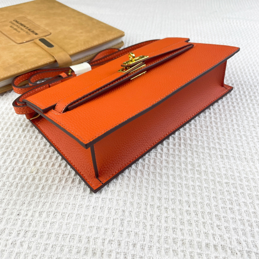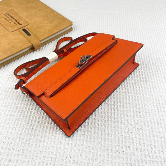 The Hermes Kelly Pochette from Hermes Replica is a refined and elegant clutch, inspired by the classic Kelly bag. Made from smooth, high-quality leather, it features the signature flap, top handle, and a sleek, compact shape.
