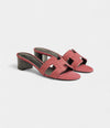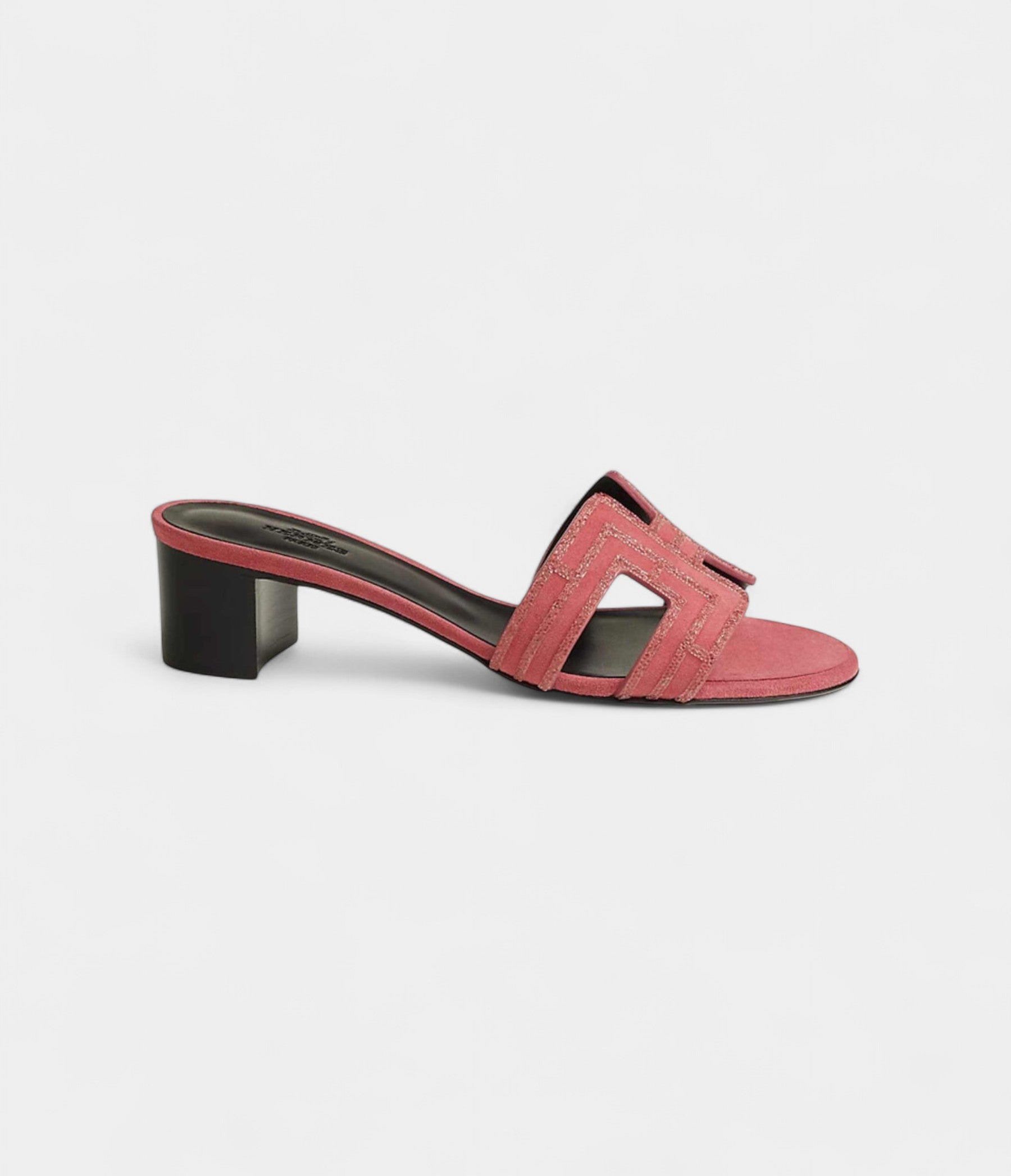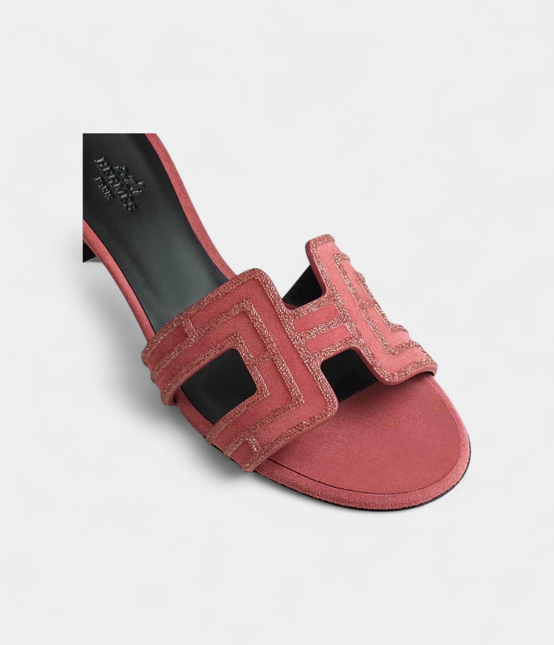 Hermès Oasis Sandals Calfskin Suede Rhinestone Rose Amarante offer a luxurious fusion of texture, sparkle, and rich color, crafted from velvety suede calfskin in the deep and captivating Rose Amarante shade that radiates elegance and depth. Accentuated with delicately placed rhinestones, the iconic H-cut upper brings a touch of brilliance to the structured silhouette, enhancing the visual impact without overpowering the design’s refined balance.
