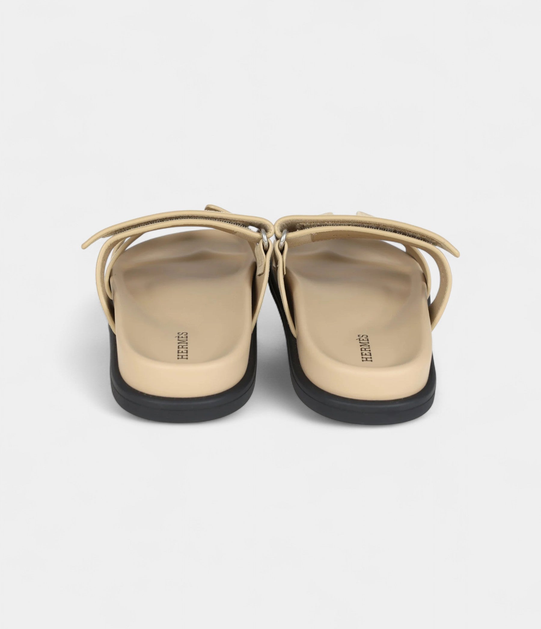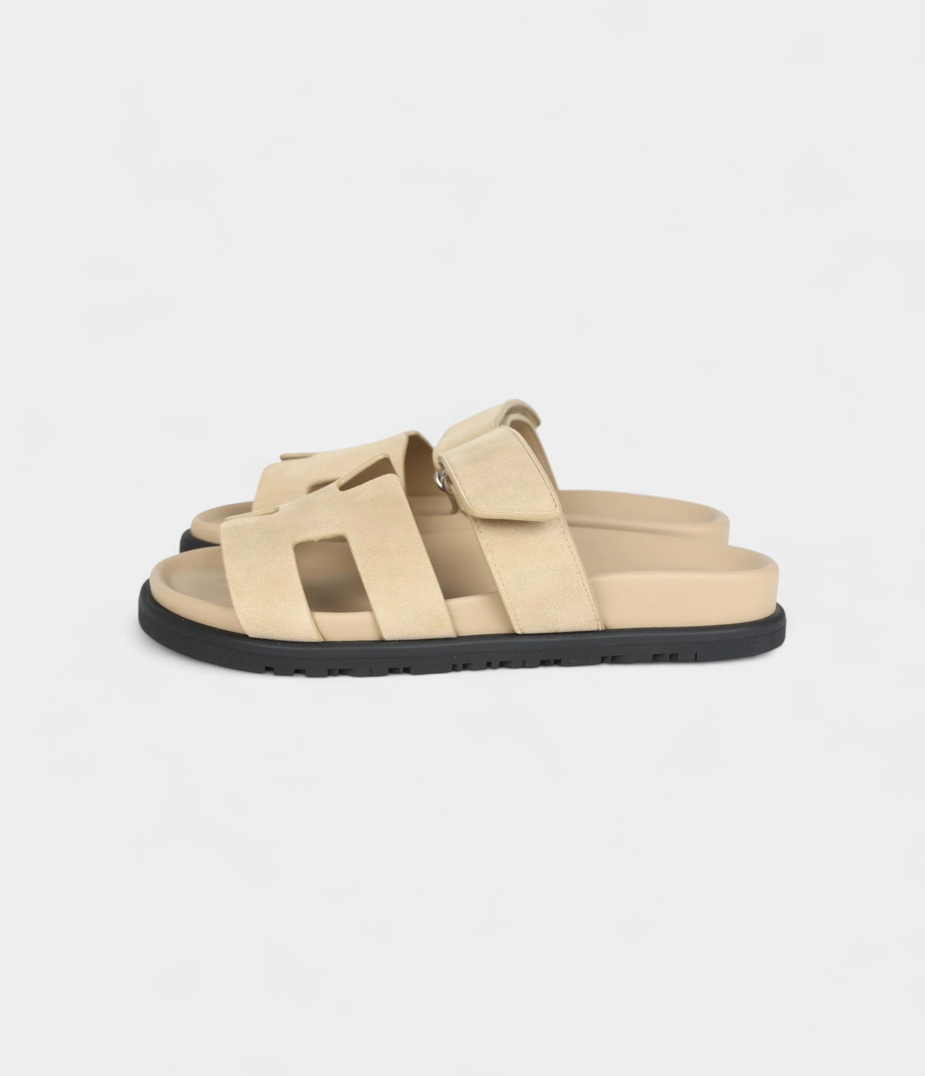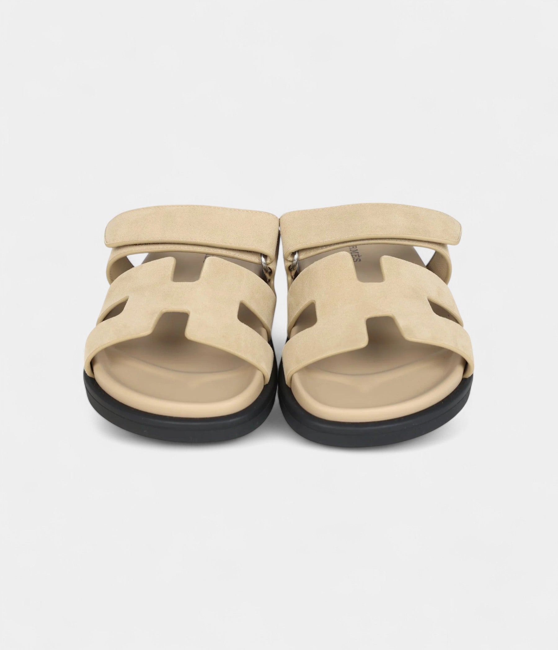 The Hermès Chypre Techno Sandals in Beige Lin Suede with Palladium Hardware blend soft sophistication with contemporary luxury for effortless elegance.