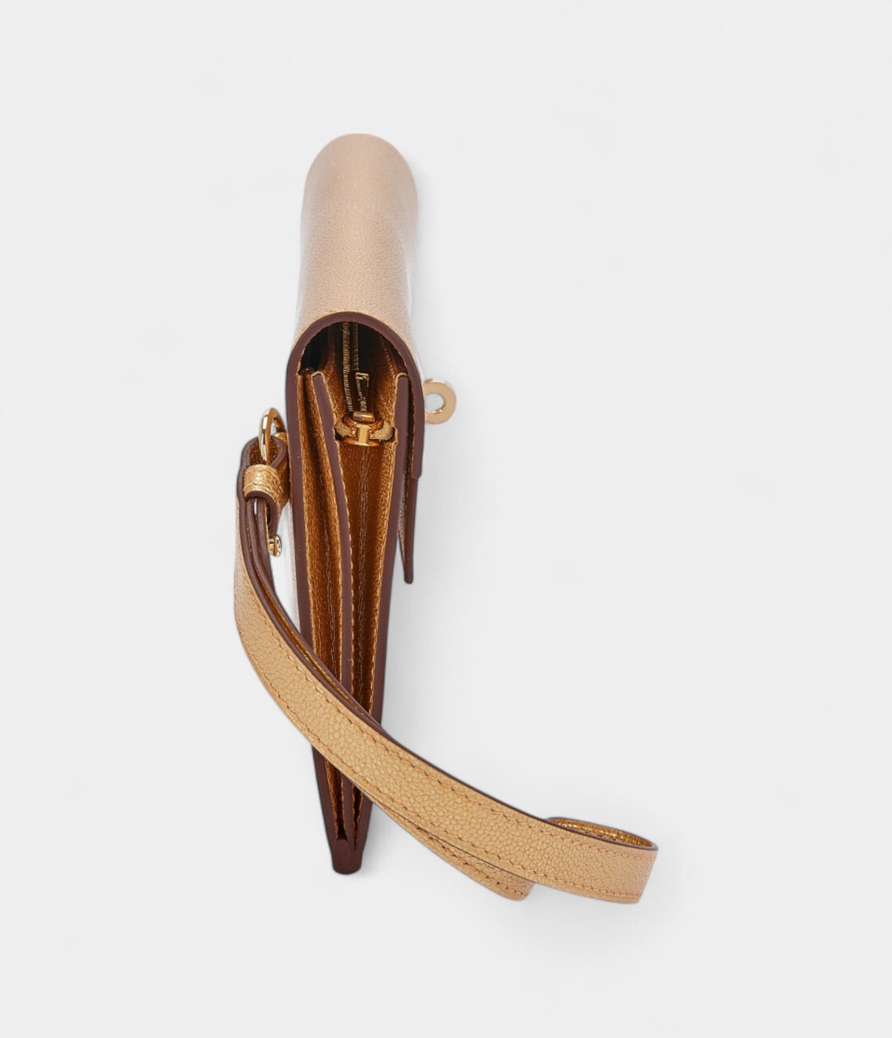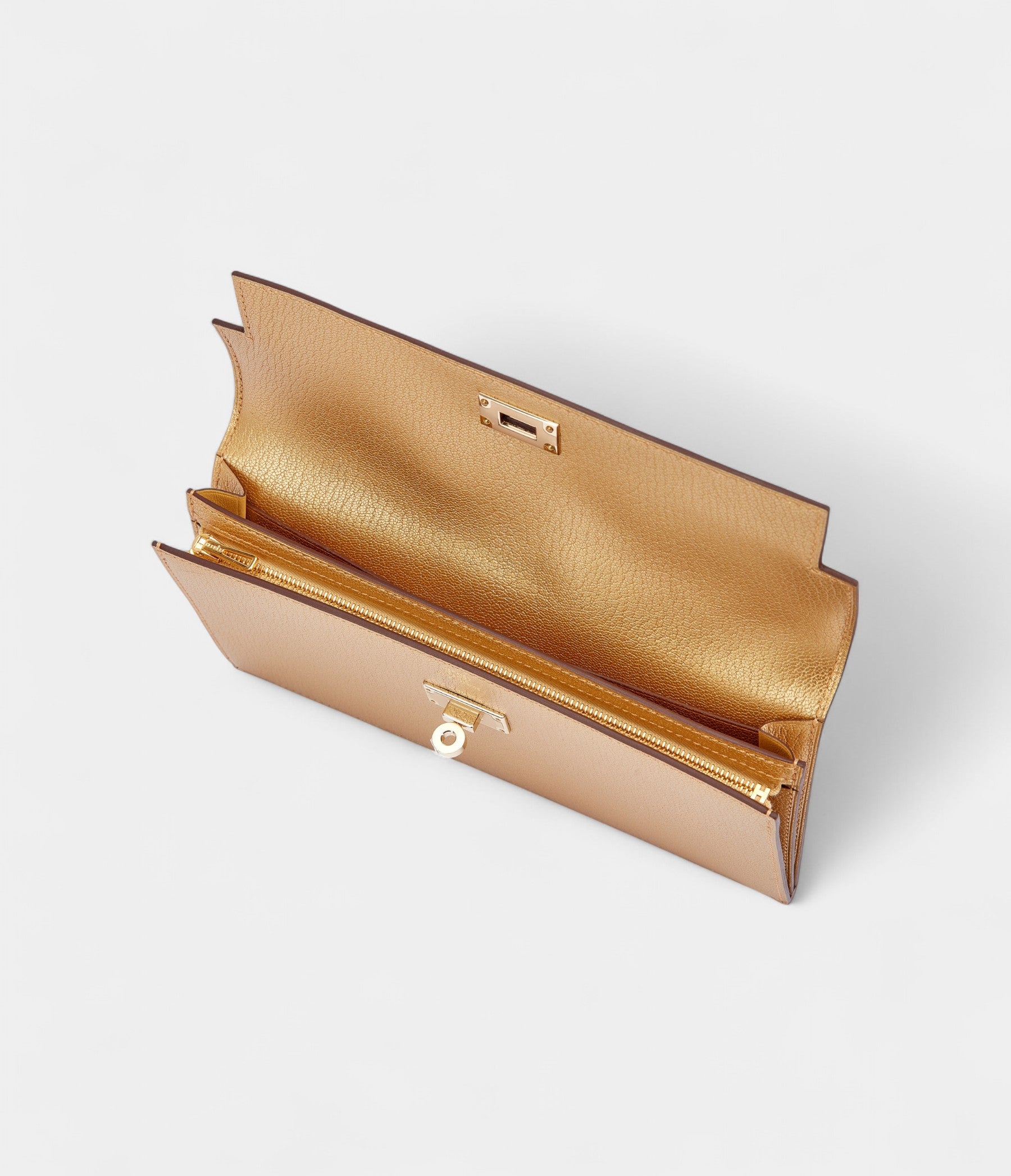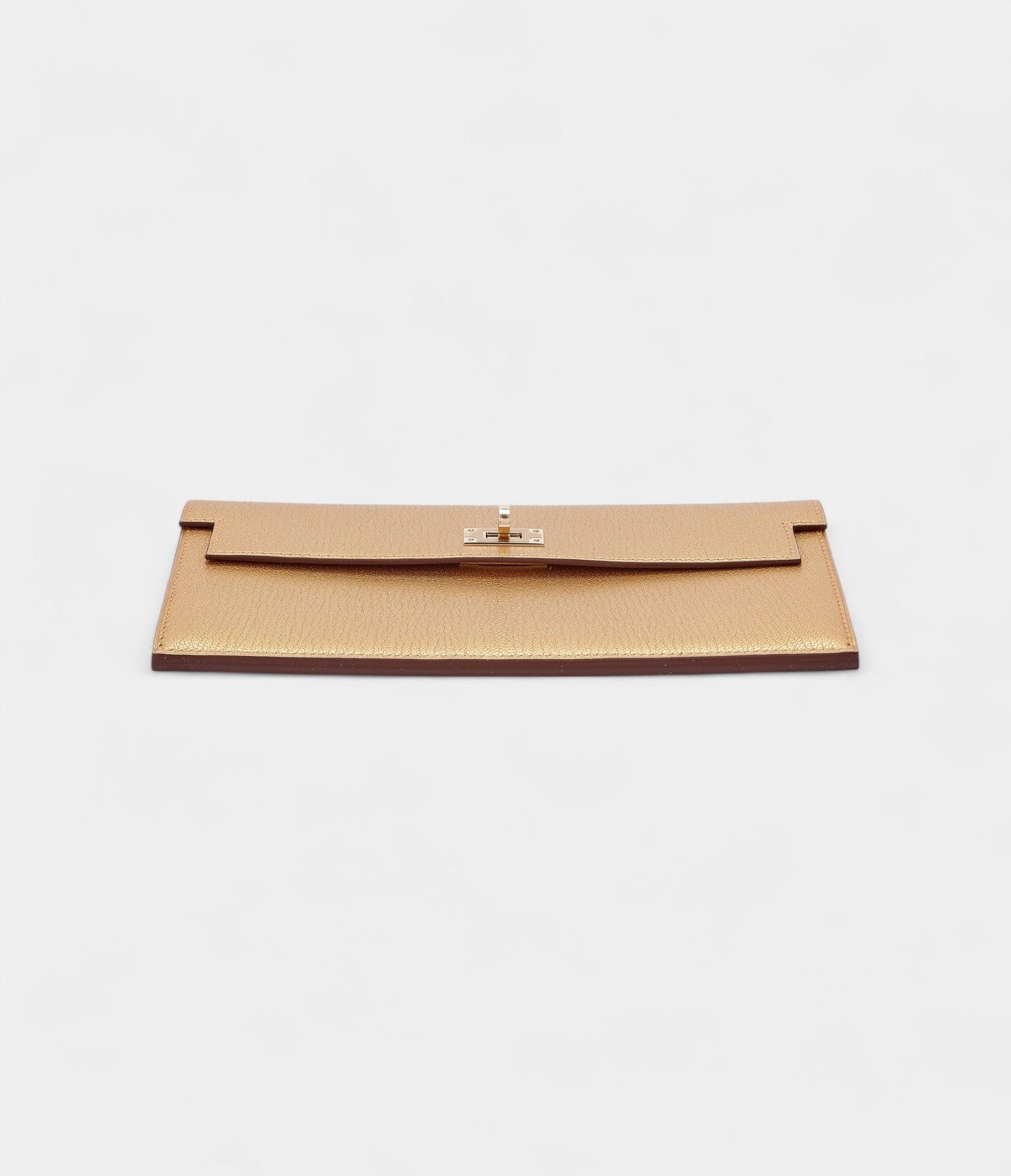 Accented with permabrass hardware, which offers a soft golden tone that complements the metallic finish, the wallet features the signature Kelly flap and turn-lock closure. Its detachable strap transforms the wallet into a crossbody or shoulder bag, adding hands-free functionality to its elevated design. Inside, you’ll find practical features including card slots, a central zip pocket, and compartments for cash or small essentials—all within a slim, structured form.
