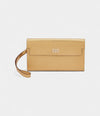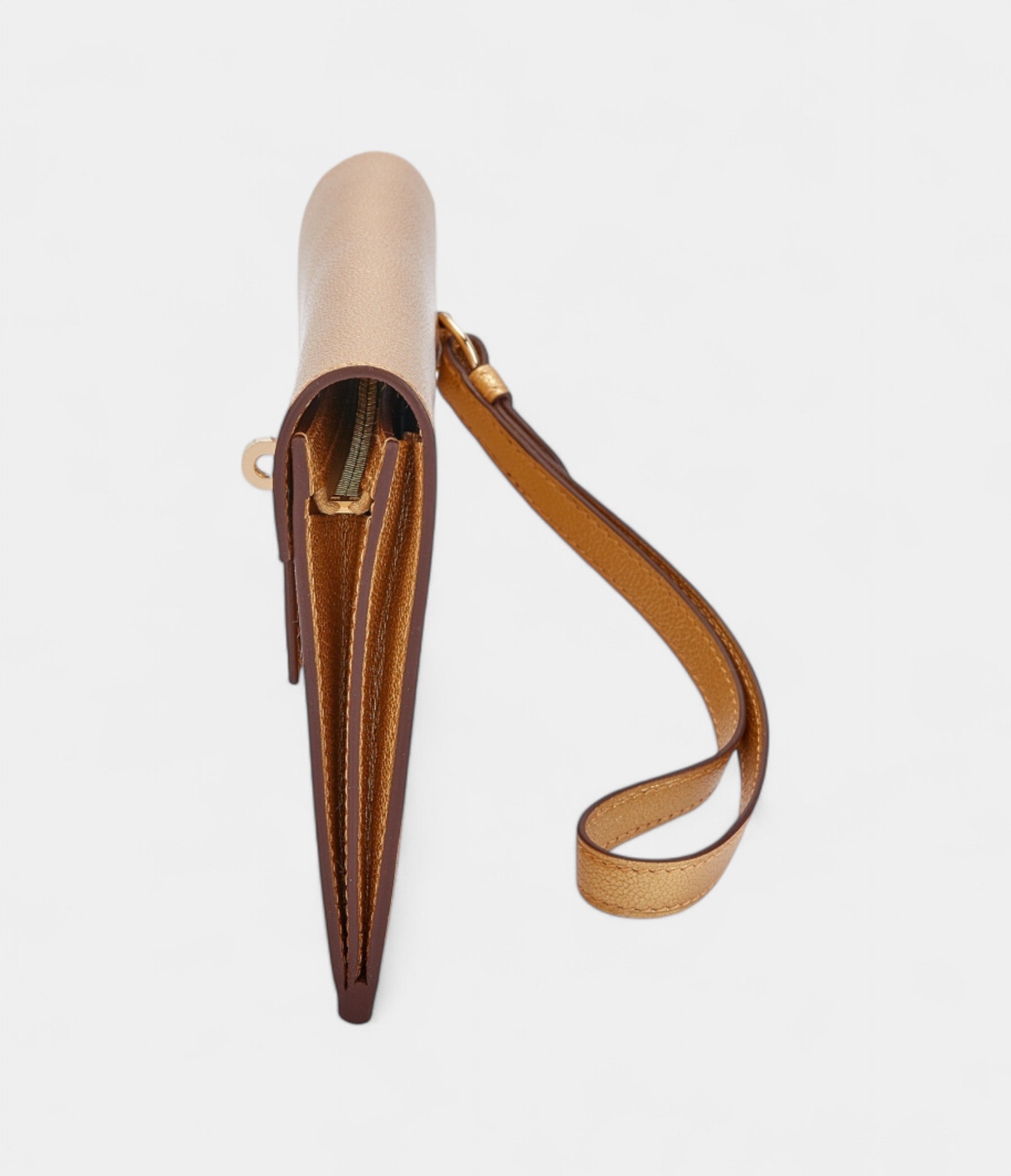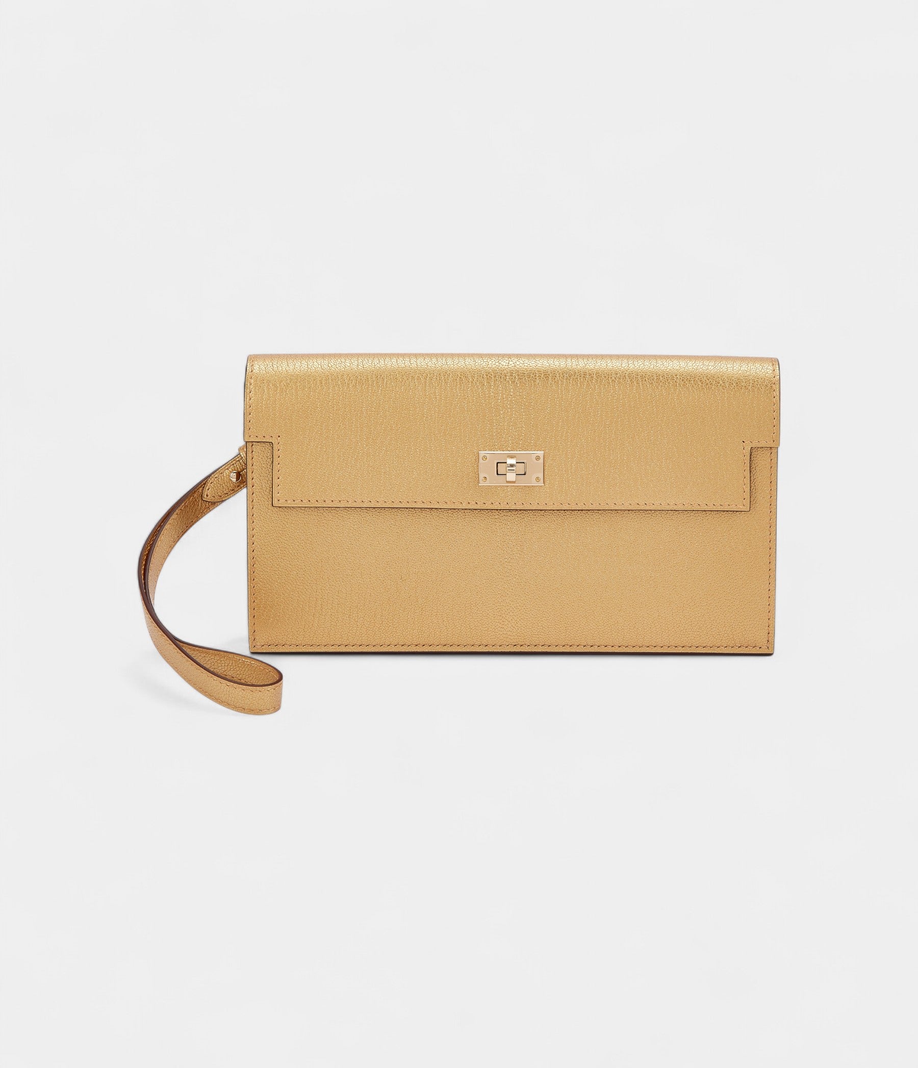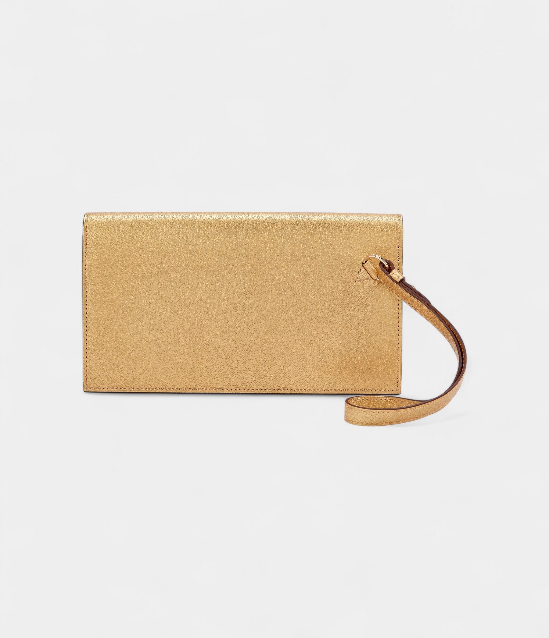 Accented with permabrass hardware, which offers a soft golden tone that complements the metallic finish, the wallet features the signature Kelly flap and turn-lock closure. Its detachable strap transforms the wallet into a crossbody or shoulder bag, adding hands-free functionality to its elevated design. Inside, you’ll find practical features including card slots, a central zip pocket, and compartments for cash or small essentials—all within a slim, structured form.