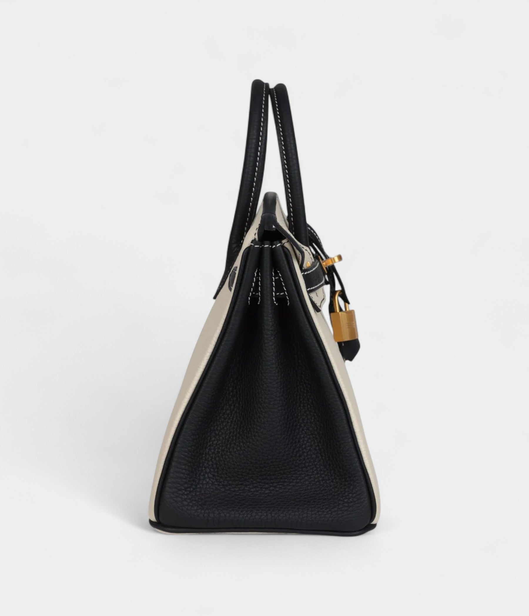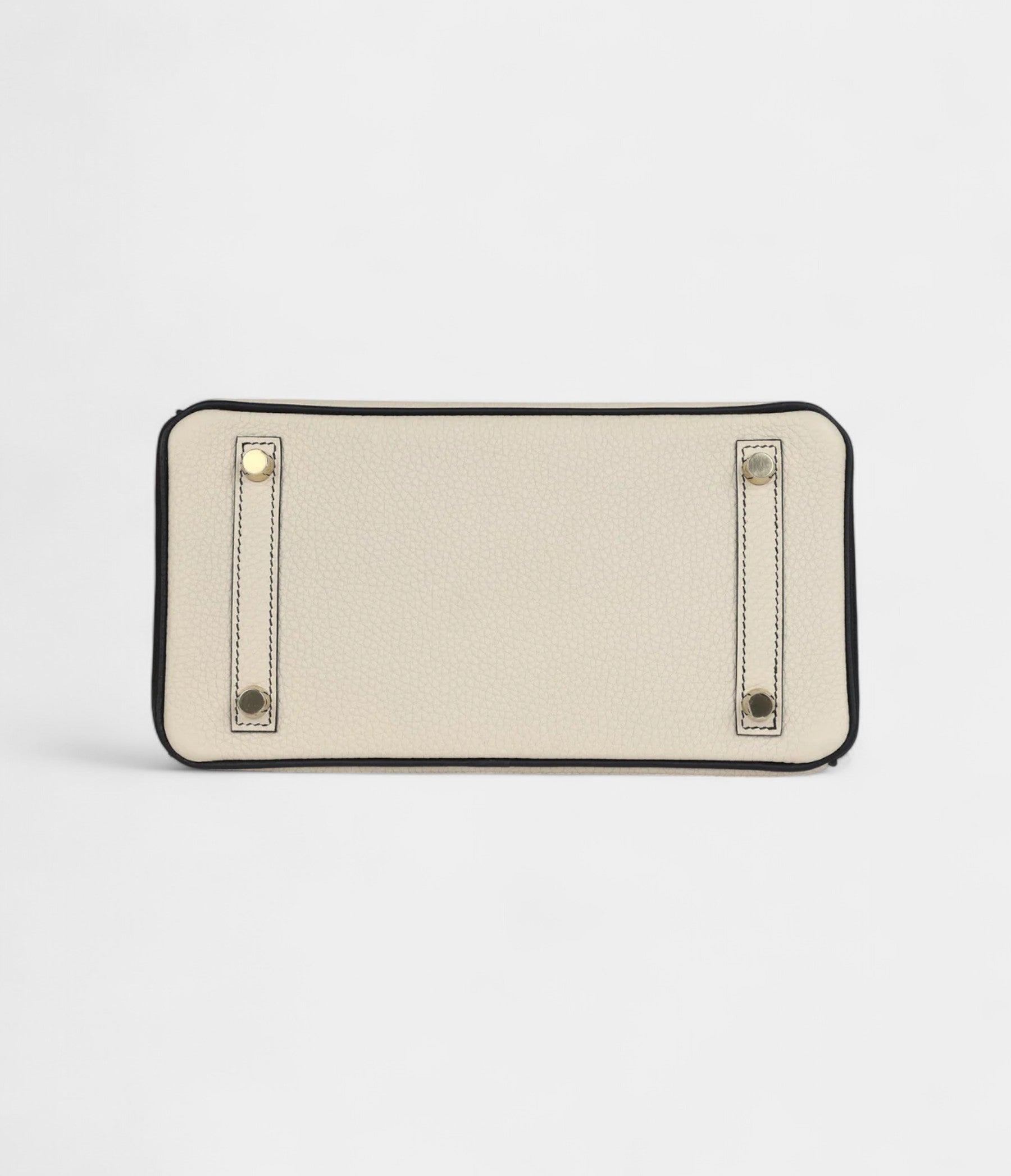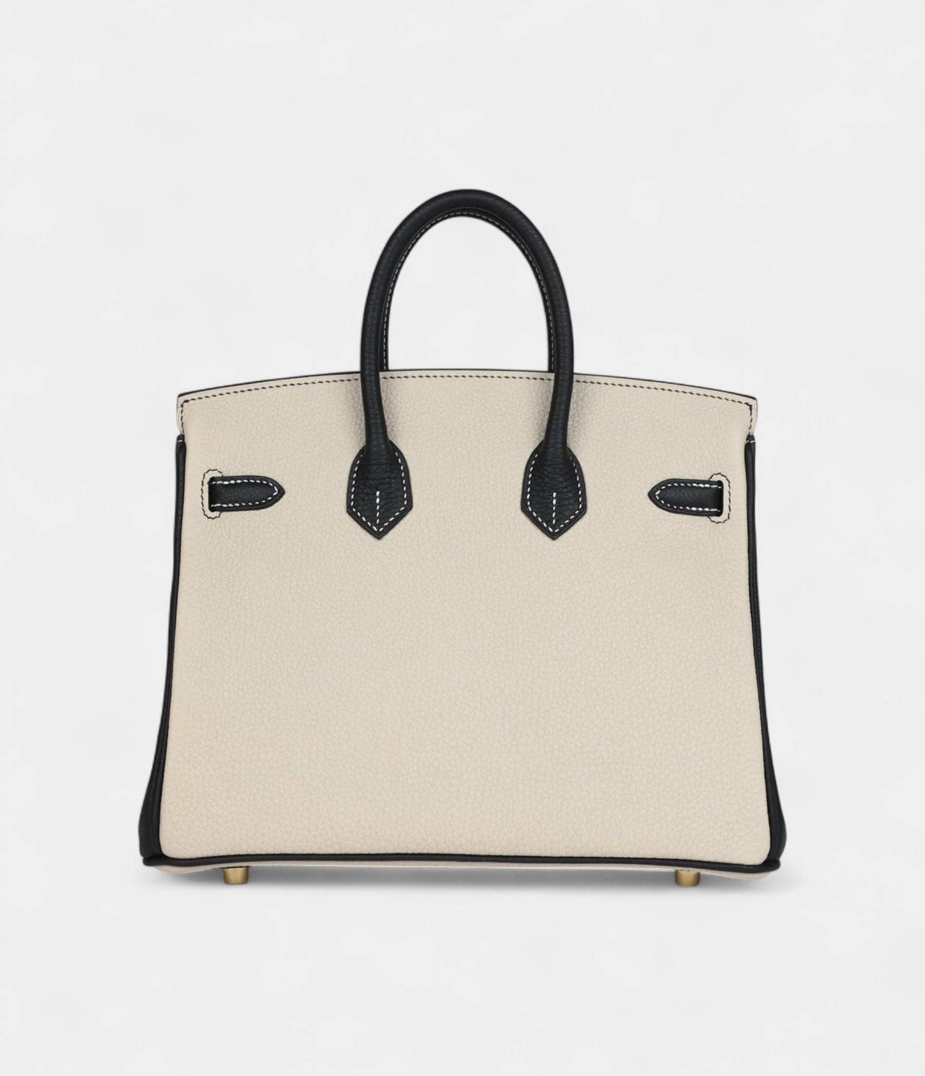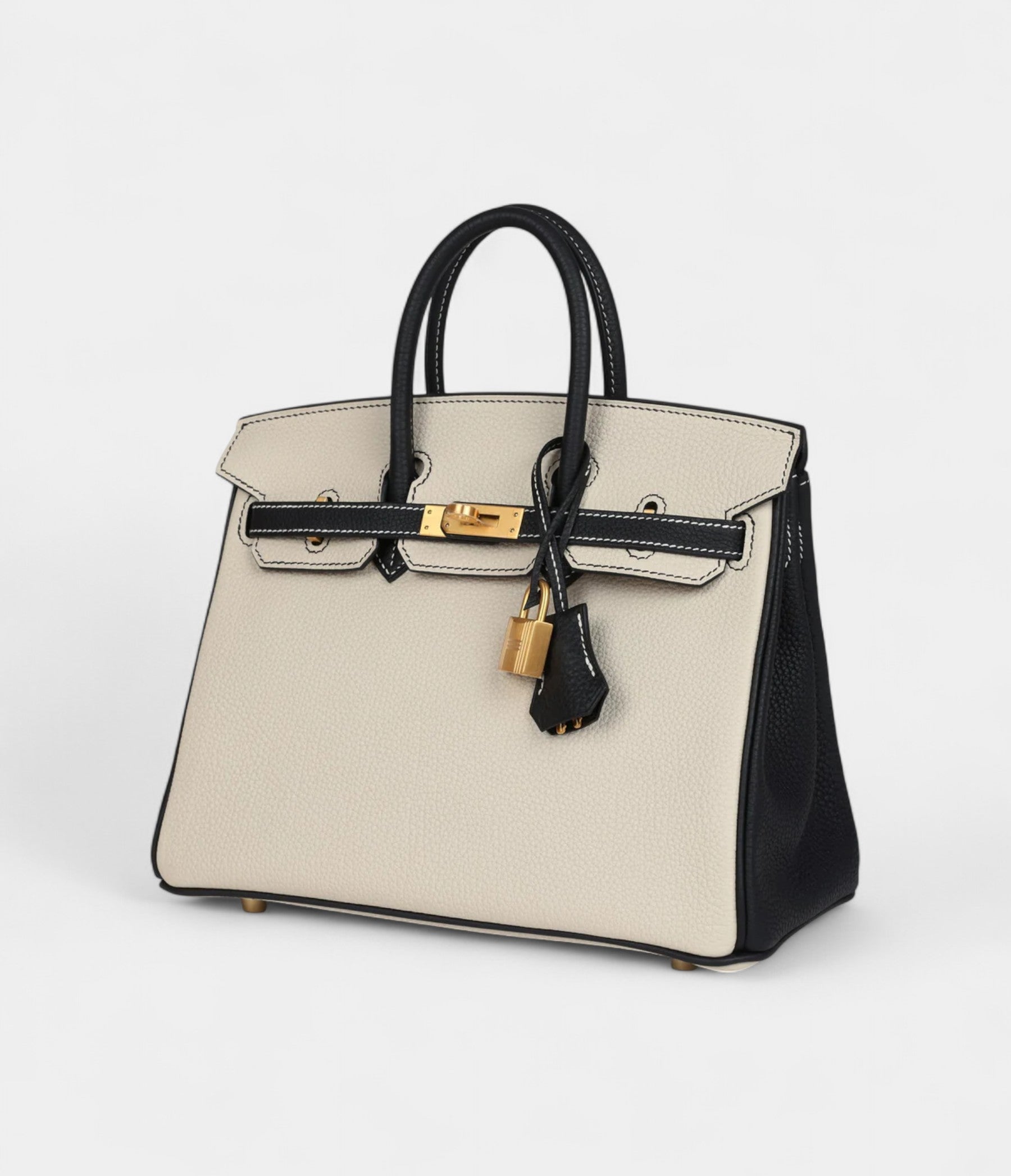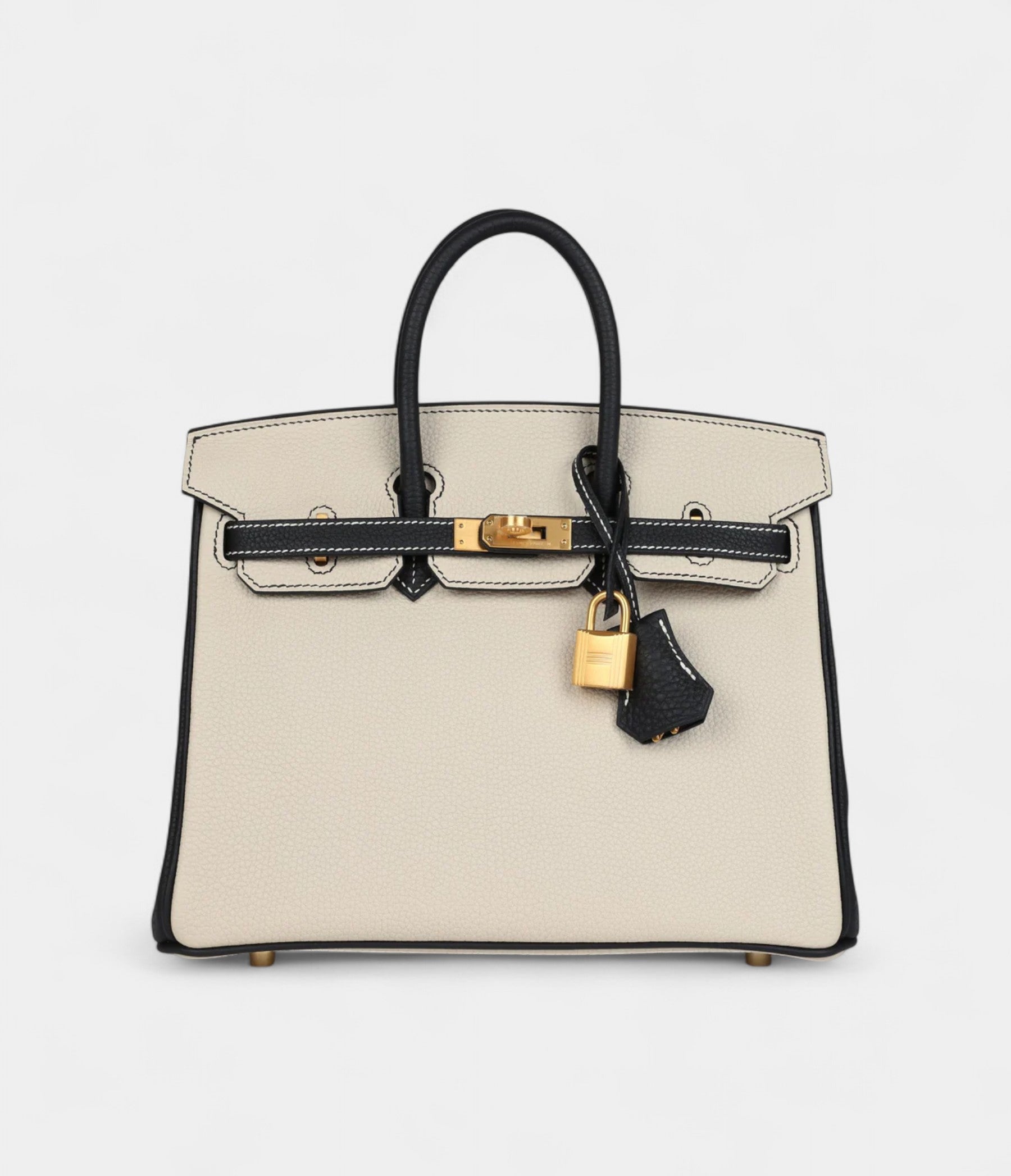 The Hermès Birkin 25 in Craie and Black Togo with brushed gold hardware is a sophisticated, high-contrast icon that redefines timeless luxury.