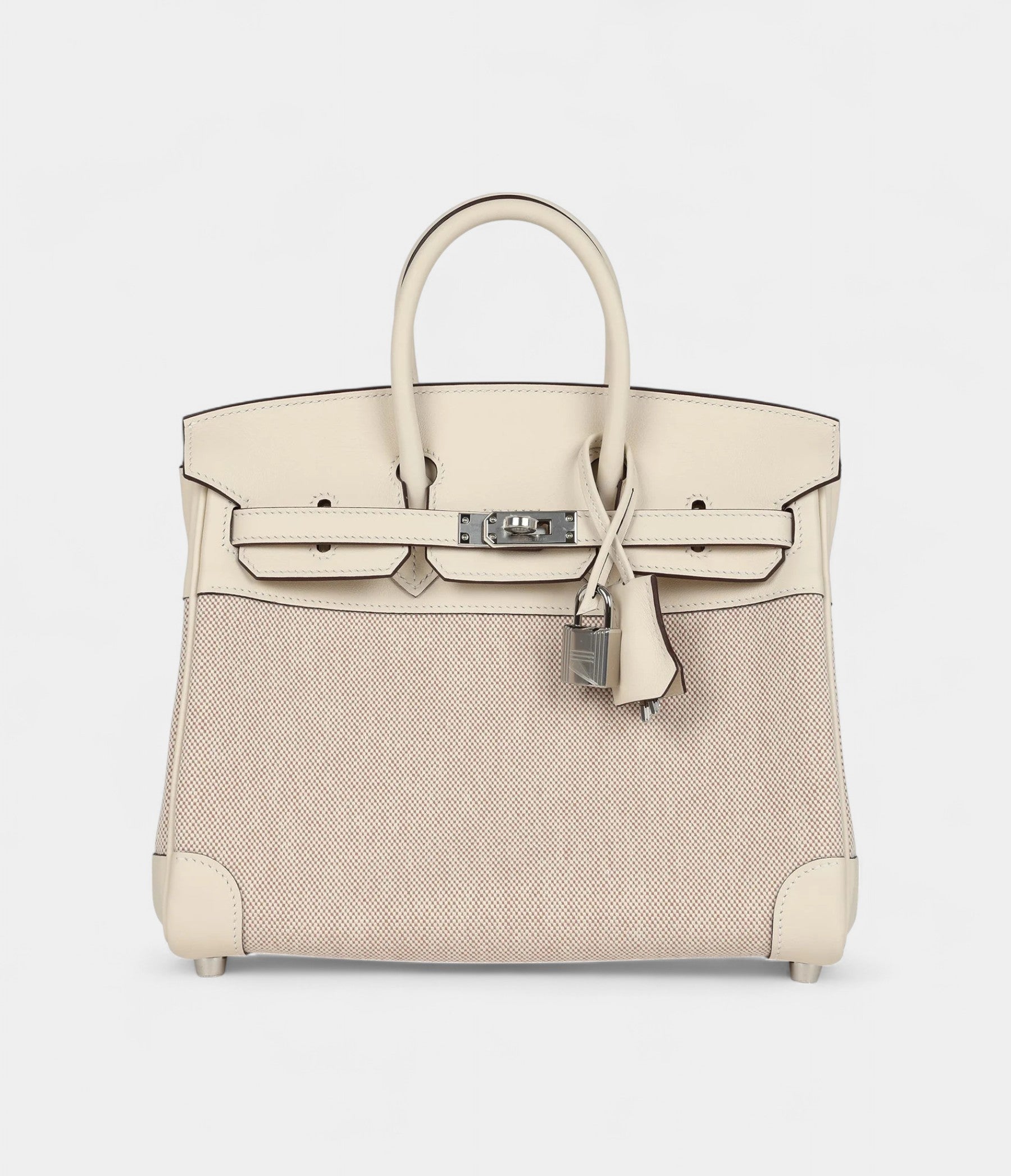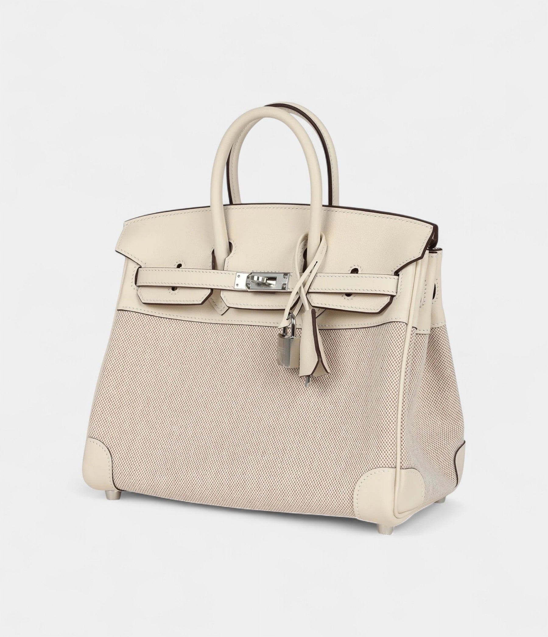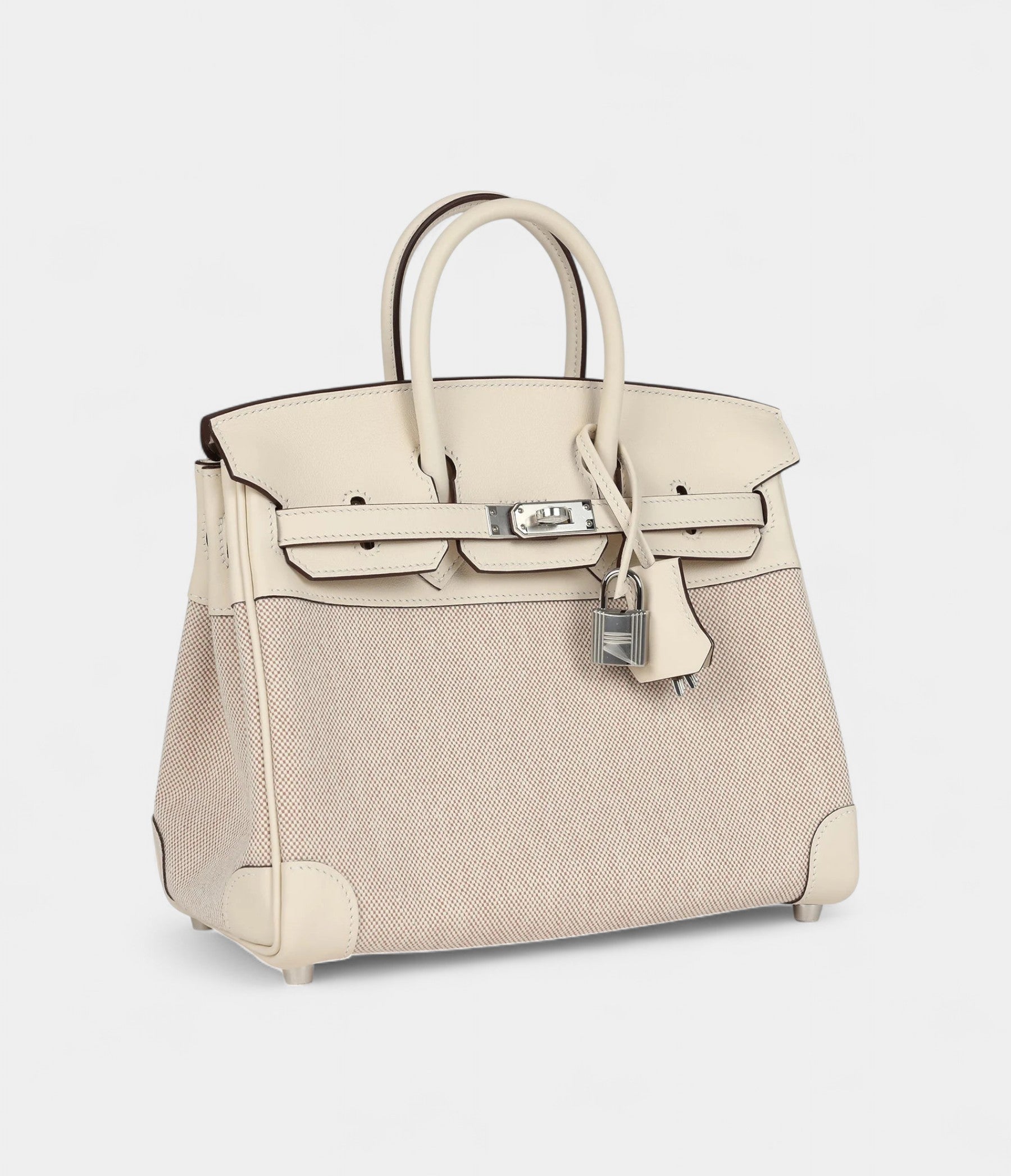 A masterclass in contrast, the Hermès Birkin 25 in Nata Swift and Ecru-Beige Toile H with palladium hardware is light, luxe, and effortlessly refined.