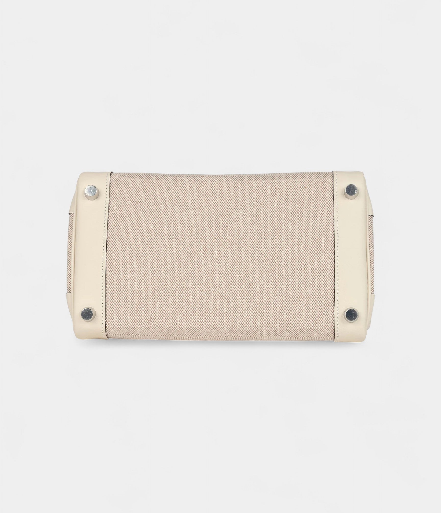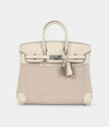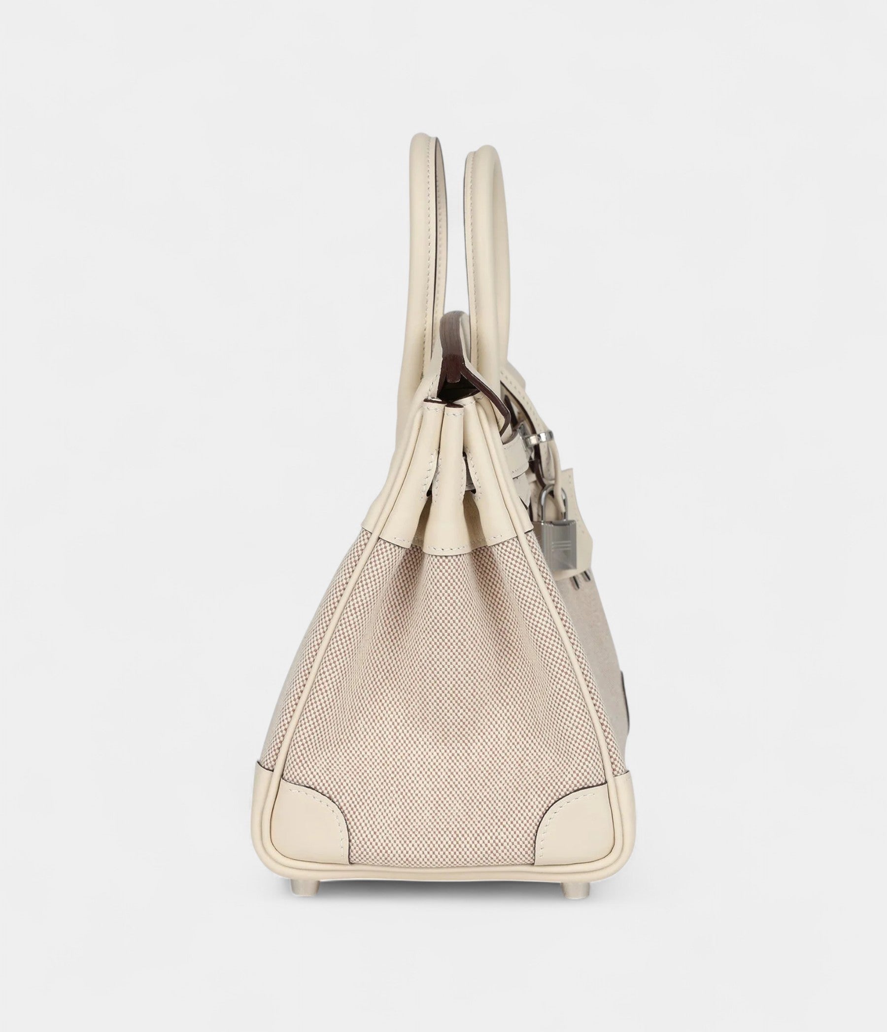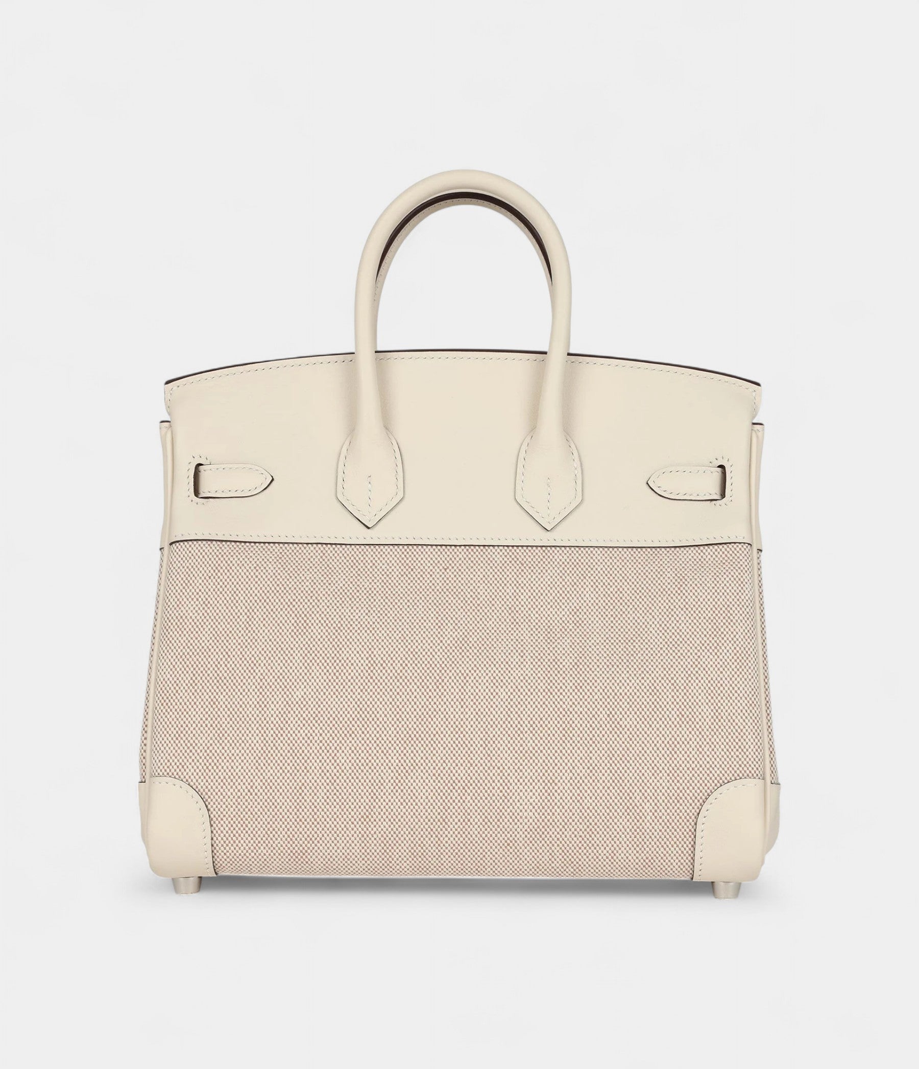 A masterclass in contrast, the Hermès Birkin 25 in Nata Swift and Ecru-Beige Toile H with palladium hardware is light, luxe, and effortlessly refined.