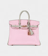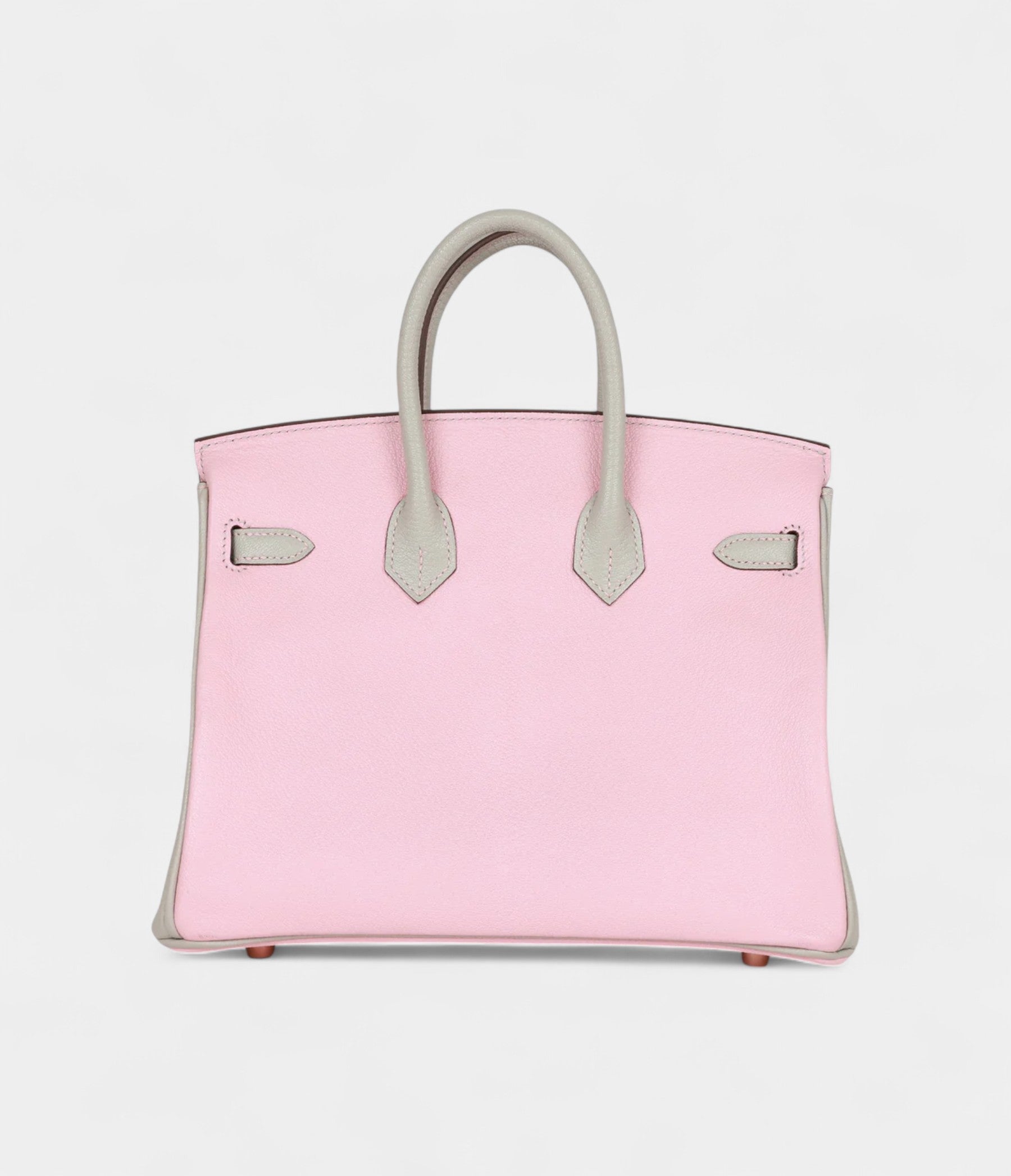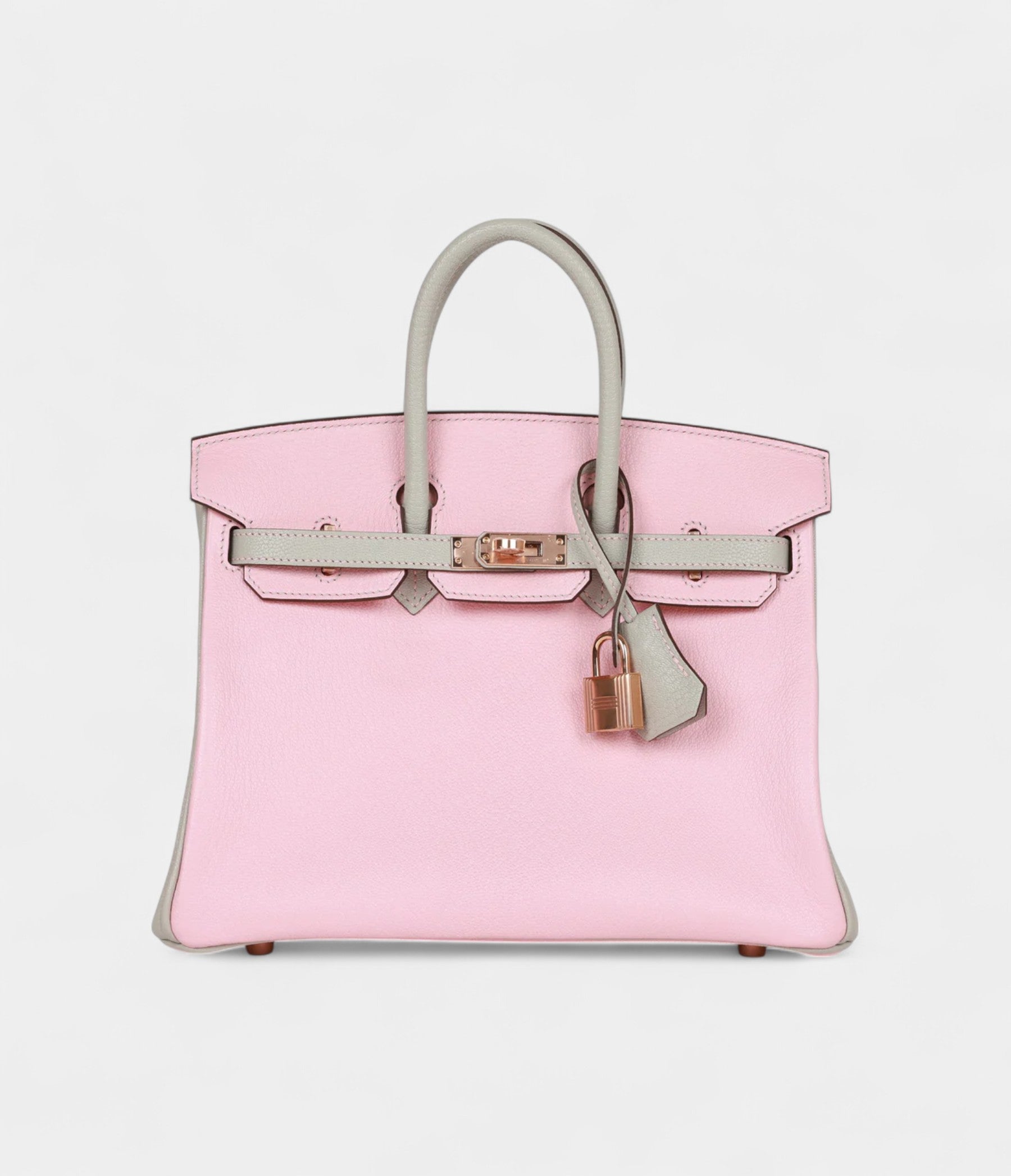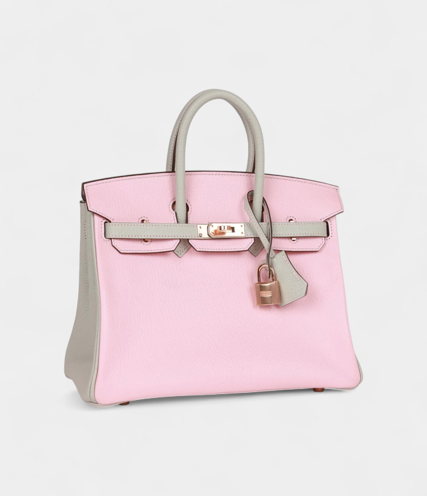The Hermès Birkin 25 in Rose Sakura and Gris Perle Chevre Mysore with rose gold hardware is a pastel dream of elegance, rarity, and gentle sophistication.