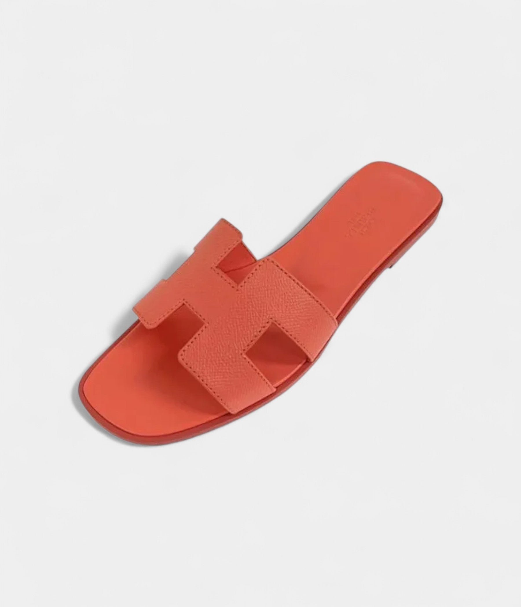 The Hermès Oran Sandals in Orange Red are a perfect blend of elegance and understated luxury, crafted from premium Box or Epsom calfskin leather. The sandals feature the signature "H" cut-out design, which is a hallmark of Hermès' timeless sophistication. With a leather sole, these sandals offer comfort and long-lasting wear, while the luxurious goatskin insole and lining ensure a smooth, comfortable feel.