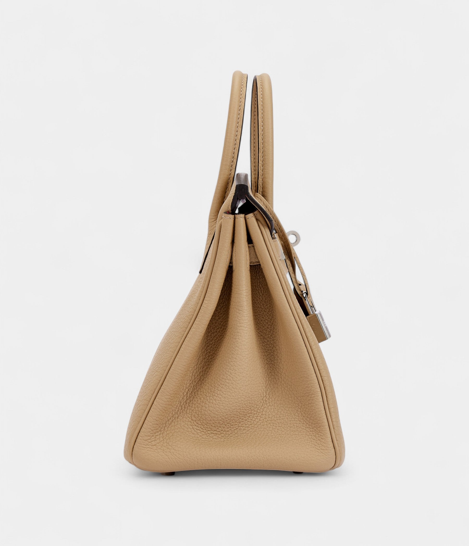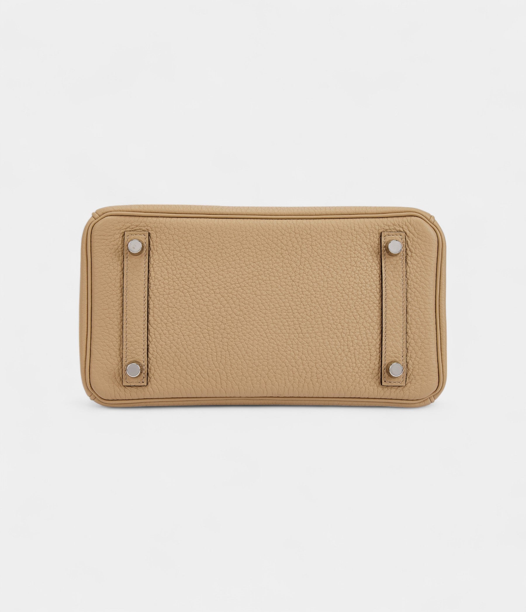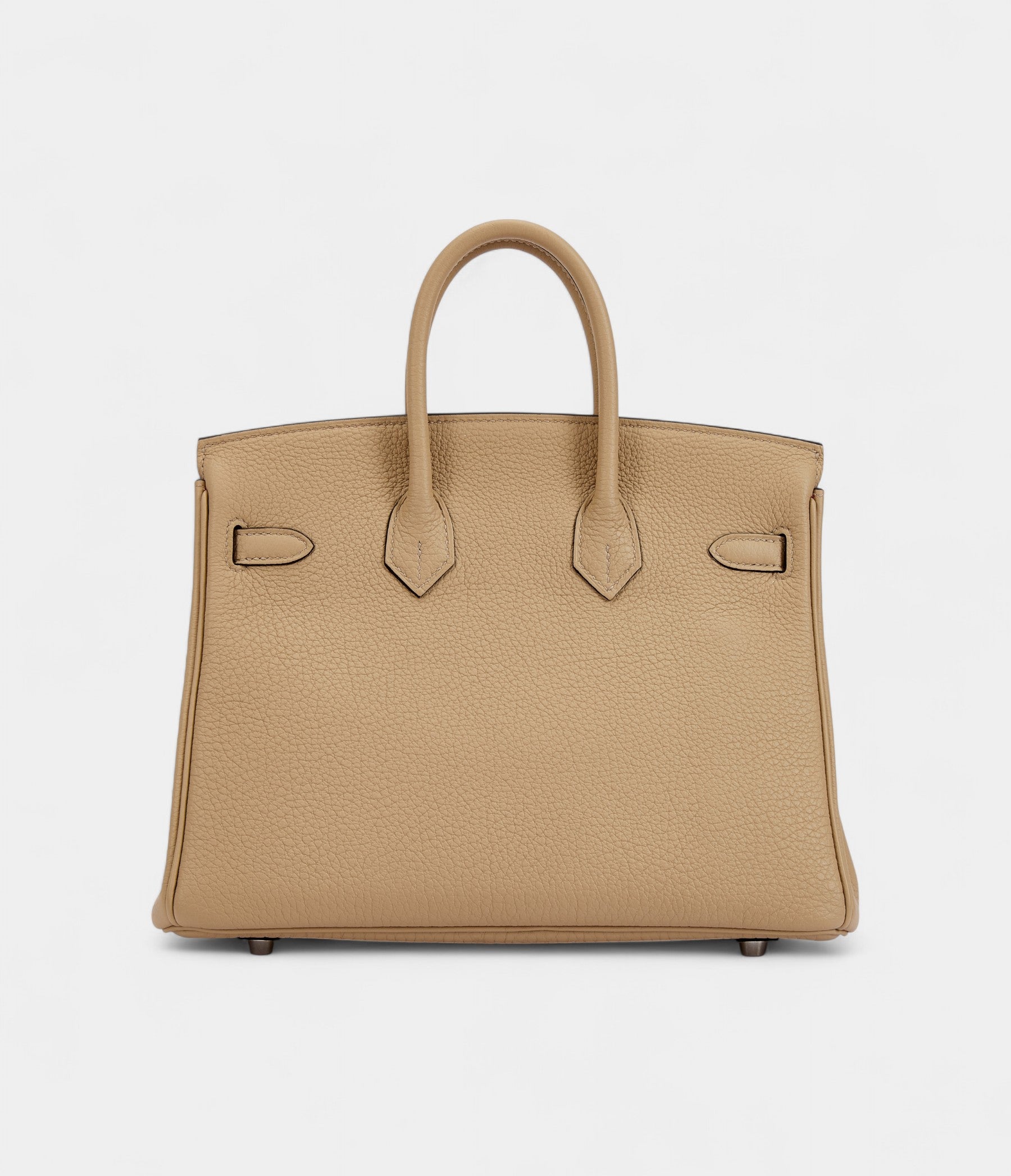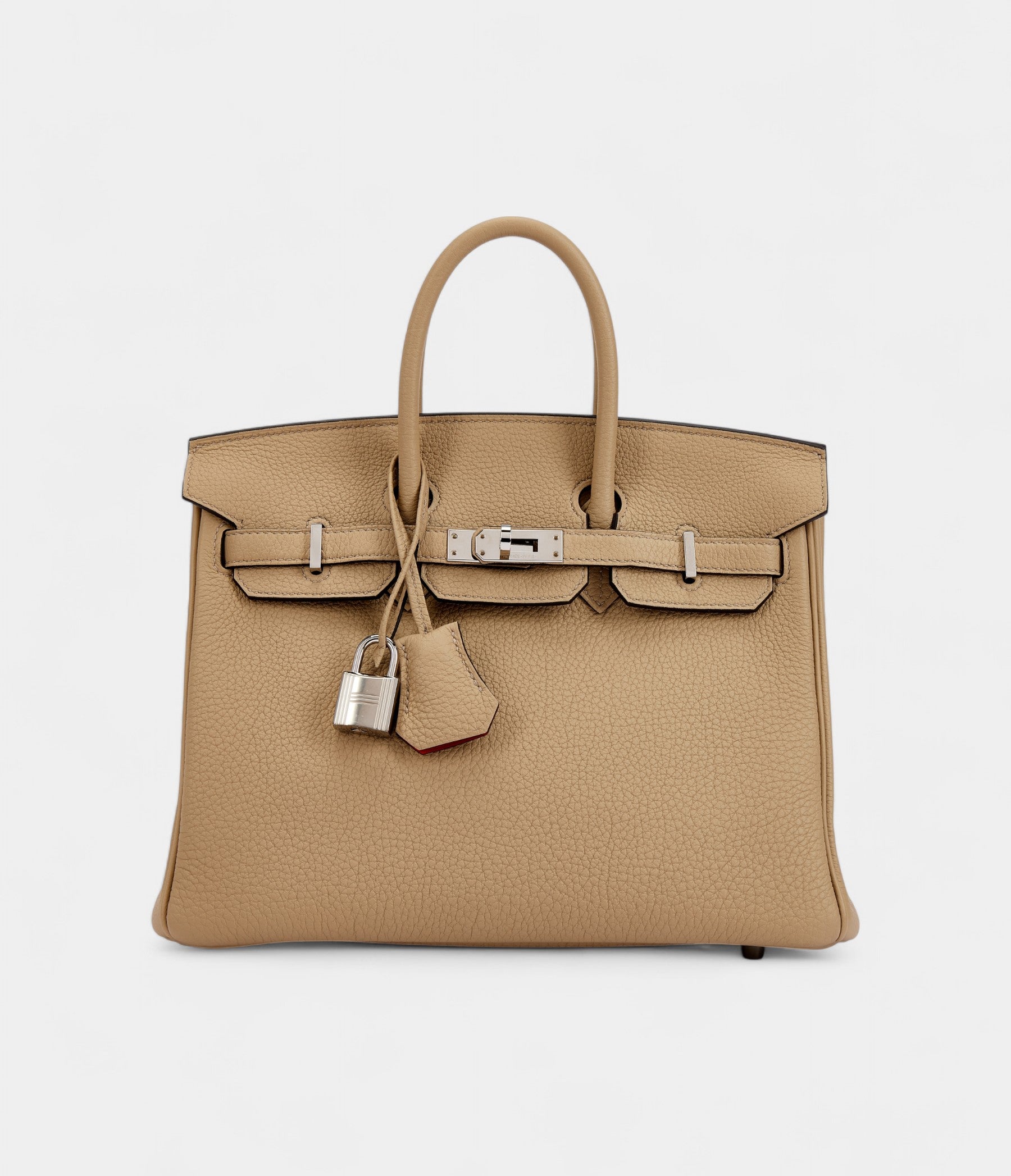 Striking in contrast and rich in detail, the Hermès Birkin 25 in Trench Togo leather with Bougainvillea Verso and palladium hardware offers a refined twist on the classic neutral. The exterior features the beloved “Trench” hue—a soft beige with warm undertones—paired with a vibrant Bougainvillea pink interior, delivering a bold yet elegant surprise with every open.