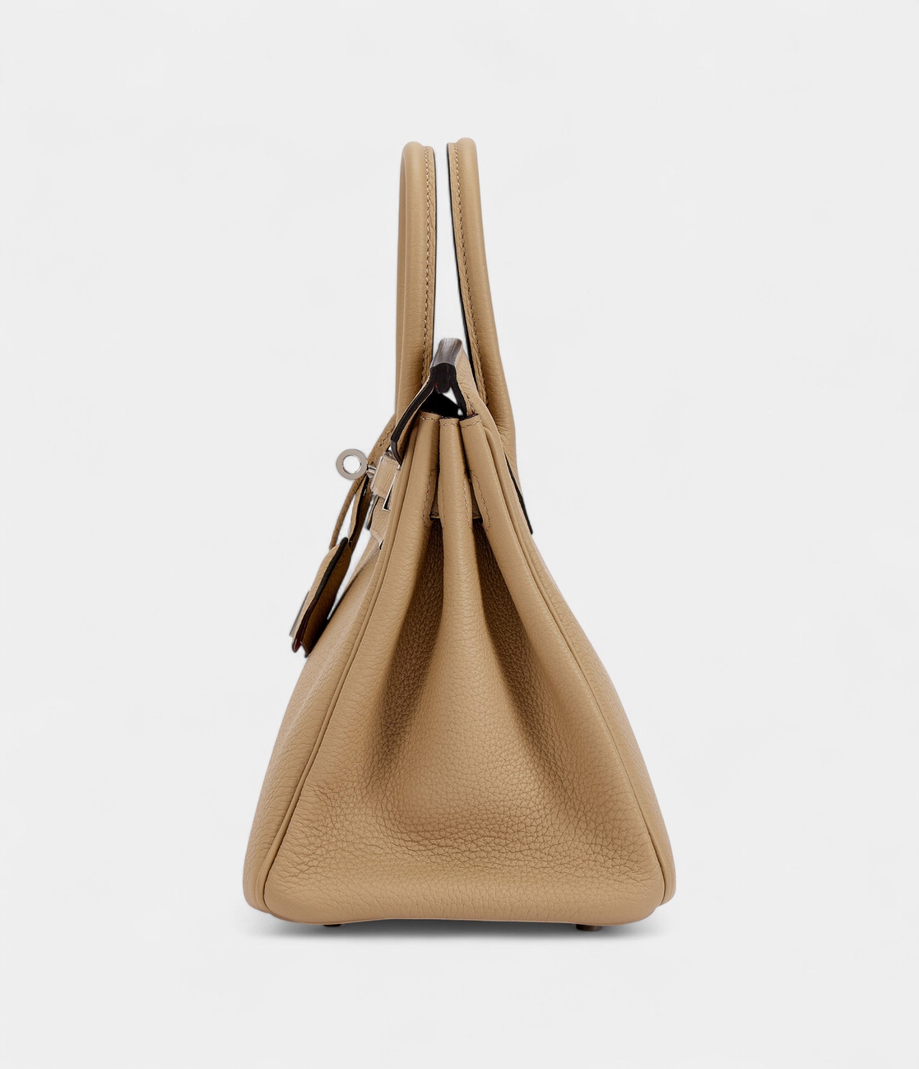 Crafted in Togo leather, known for its durability and soft-grained texture, this Birkin balances structure with suppleness. The cool, polished palladium hardware adds a sleek finish, perfectly complementing the understated sophistication of the outer tone and the spirited flash of color within.